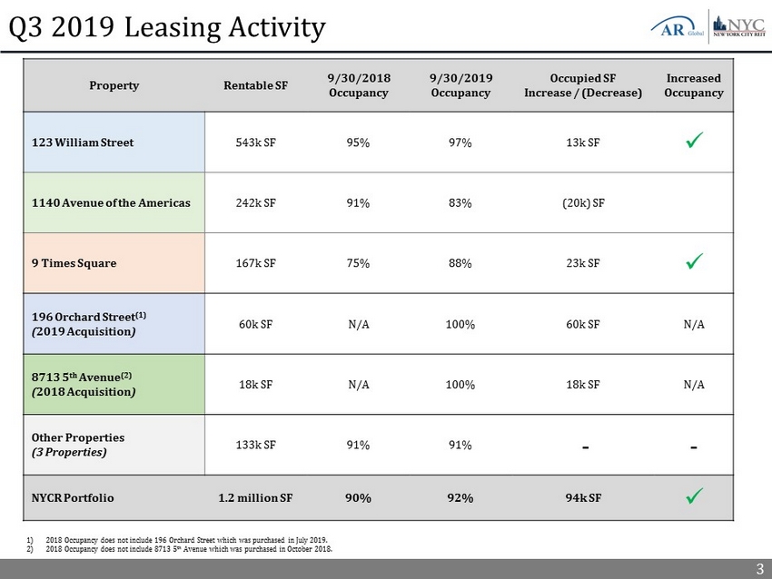 2 NYCR Highlights ▪ Increased portfolio occupancy from 90.3% to 92.4% year - over - year ▪ 9 Times Square lease - up has been extremely successful with occupancy materially increasing from 74.6% in Q3 2018 to 88.2% in Q3 2019 ▪ In July, the Company acquired a fee - simple interest in three retail condominium units located at 196 Orchard Street in Manhattan for an aggregate contract sale price of $89 million, excluding acquisition related costs ▪ Retail condominium units consist of approximately 60,000 rentable square feet and are currently 100% leased to three high quality tenants (CVS, Equinox and Marshalls) ▪ All three tenants are subject to rent escalators and have a weighted average remaining lease term of 13 years ▪ The Company entered into a 10 - year term loan with Nationwide Life Insurance Company for $51 million with an attractive fixed interest rate of 3.85% relating to the acquisition of 196 Orchard Street ▪ On September 13, Christopher Masterson was unanimously elected as CFO and Treasurer of the Company ▪ Christopher also currently serves as CFO of Global Net Lease, Inc. (NYSE: GNL) and previously held accounting roles at Goldman Sachs and KPMG New York City REIT increased portfolio occupancy to over 92%