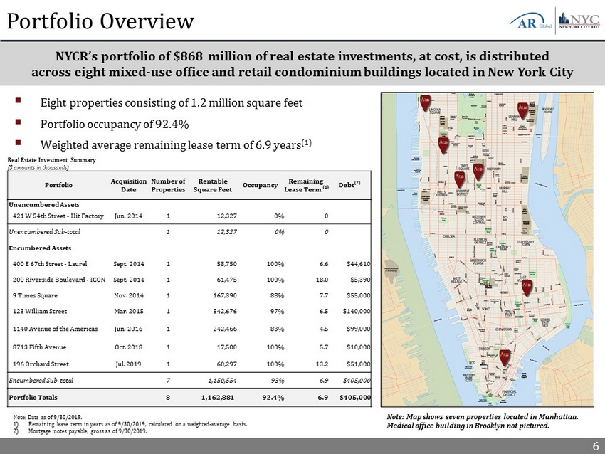 5 NYCR continues to be bullish on the long - term fundamentals in the New York City real estate market, particularly in the Manhattan office market New York City Market Trends NYC population is forecasted to reach 8.8 million people in 2030 Overall Vacancy Rate - Manhattan Office (2) 7.1 7.3 8.0 8.24 8.6 8.8 5.0 5.5 6.0 6.5 7.0 7.5 8.0 8.5 9.0 9.5 1980 1990 2000 2010 2020 2030 Millions NYC employment is currently at a historical ten - year high NYC Population at Record High (3) 3,712 3,730 3,818 3,905 3,999 4,130 4,255 4,341 4,414 4,525 4,632 0 1,000 2,000 3,000 4,000 5,000 2009 2010 2011 2012 2013 2014 2015 2016 2017 2018 2019 NYC Employment Trends (1) Jobs in 000's 1) Source: Bureau of Labor Statistics. 2) Source: Cushman & Wakefield Research, Marketbeat Manhattan Office Q3 2019. 3) Source: New York City Department of City Planning. Manhattan Overall Net Absorption/Asking Rents (2)