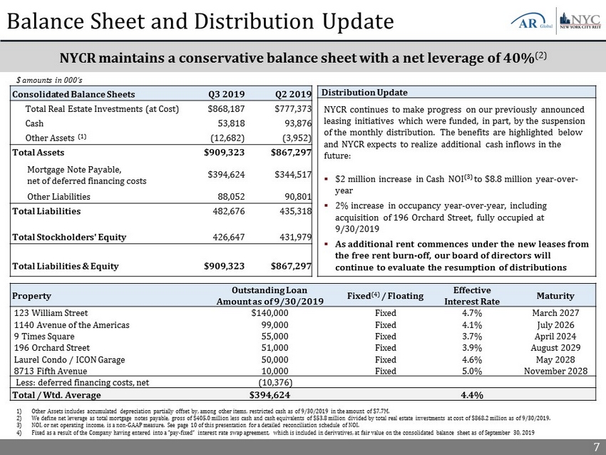 6 Portfolio Overview Note: Data as of 9/30/2019. 1) Remaining lease term in years as of 9/30/2019, calculated on a weighted - average basis. 2) Mortgage notes payable, gross as of 9/30/2019. ▪ Eight properties consisting of 1.2 million square feet ▪ Portfolio occupancy of 92.4% ▪ Weighted average remaining lease term of 6.9 years (1) NYCR’s portfolio of $868 million of real estate investments, at cost, is distributed across eight mixed - use office and retail condominium buildings located in New York City Note: Map shows seven properties located in Manhattan. Medical office building in Brooklyn not pictured. Real Estate Investment Summary ($ amounts in thousands) Portfolio Acquisition Date Number of Properties Rentable Square Feet Occupancy Remaining Lease Term (1) Debt (2) Unencumbered Assets 421 W 54th Street - Hit Factory Jun. 2014 1 12,327 0% 0 Unencumbered Sub - total 1 12,327 0% 0 Encumbered Assets 400 E 67th Street - Laurel Sept. 2014 1 58,750 100% 6.6 $44,610 200 Riverside Boulevard - ICON Sept. 2014 1 61,475 100% 18.0 $5,390 9 Times Square Nov. 2014 1 167,390 88% 7.7 $55,000 123 William Street Mar. 2015 1 542,676 97% 6.5 $140,000 1140 Avenue of the Americas Jun. 2016 1 242,466 83% 4.5 $99,000 8713 Fifth Avenue Oct. 2018 1 17,500 100% 5.7 $10,000 196 Orchard Street Jul. 2019 1 60,297 100% 13.2 $51,000 Encumbered Sub - total 7 1,150,554 93% 6.9 $405,000 Portfolio Totals 8 1,162,881 92.4% 6.9 $405,000