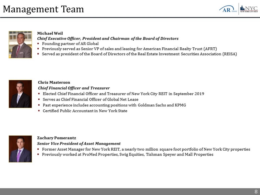 8 Management Team Chris Masterson Chief Financial Officer and Treasurer ▪ Elected Chief Financial Officer and Treasurer of New York City REIT in September 2019 ▪ Serves as Chief Financial Officer of Global Net Lease ▪ Past experience includes accounting positions with Goldman Sachs and KPMG ▪ Certified Public Accountant in New York State Michael Weil Chief Executive Officer, President and Chairman of the Board of Directors ▪ Founding partner of AR Global ▪ Previously served as Senior VP of sales and leasing for American Financial Realty Trust (AFRT) ▪ Served as president of the Board of Directors of the Real Estate Investment Securities Association (REISA) Zachary Pomerantz Senior Vice President of Asset Management ▪ Former Asset Manager for New York REIT, a nearly two million square foot portfolio of New York City properties ▪ Previously worked at ProMed Properties, Swig Equities, Tishman Speyer and Mall Properties