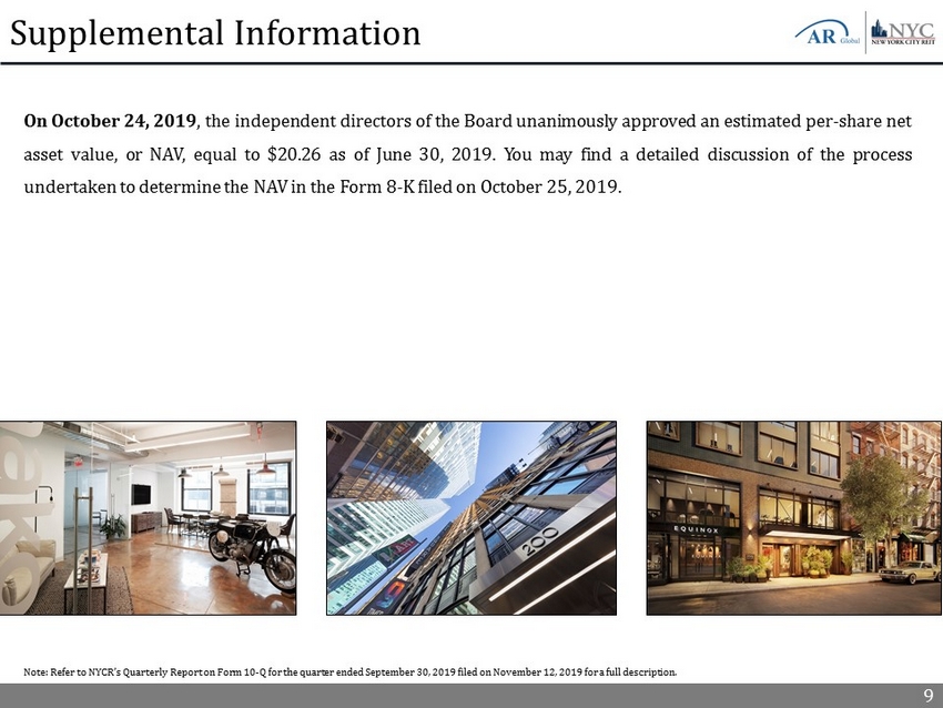 9 Supplemental Information On October 24 , 2019 , the independent directors of the Board unanimously approved an estimated per - share net asset value, or NAV, equal to $ 20 . 26 as of June 30 , 2019 . You may find a detailed discussion of the process undertaken to determine the NAV in the Form 8 - K filed on October 25 , 2019 . Note: Refer to NYCR’s Quarterly Report on Form 10 - Q for the quarter ended September 30, 2019 filed on November 12, 2019 for a fu ll description.