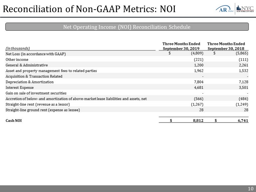 10 Reconciliation of Non - GAAP Metrics: NOI Net Operating Income (NOI) Reconciliation Schedule (in thousands) Three Months Ended September 30, 2019 Three Months Ended September 30, 2018 Net Loss (in accordance with GAAP) $ (4,809) $ (5,865) Other income (221) (111) General & Administrative 1,200 2,261 Asset and property management fees to related parties 1,962 1,532 Acquisition & Transaction Related - - Depreciation & Amortization 7,804 7,128 Interest Expense 4,681 3,501 Gain on sale of investment securities - - Accretion of below - and amortization of above - market lease liabilities and assets, net (566) (484) Straight - line rent (revenue as a lessor) (1,267) (1,249) Straight - line ground rent (expense as lessee) 28 28 Cash NOI $ 8,812 $ 6,741