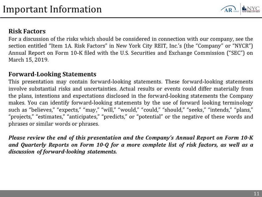 11 Important Information Risk Factors For a discussion of the risks which should be considered in connection with our company, see the section entitled “Item 1 A . Risk Factors” in New York City REIT, Inc . ’s (the “Company” or “NYCR”) Annual Report on Form 10 - K filed with the U . S . Securities and Exchange Commission (“SEC”) on March 15 , 2019 . Forward - Looking Statements This presentation may contain forward - looking statements . These forward - looking statements involve substantial risks and uncertainties . Actual results or events could differ materially from the plans, intentions and expectations disclosed in the forward - looking statements the Company makes . You can identify forward - looking statements by the use of forward looking terminology such as “believes,” “expects,” “may,” “will,” “would,” “could,” “should,” “seeks,” “intends,” “plans,” “projects,” “estimates,” “anticipates,” “predicts,” or “potential” or the negative of these words and phrases or similar words or phrases . Please review the end of this presentation and the Company’s Annual Report on Form 10 - K and Quarterly Reports on Form 10 - Q for a more complete list of risk factors, as well as a discussion of forward - looking statements .
