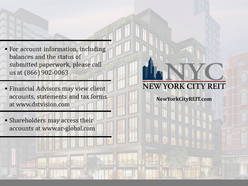 13 ▪ For account information, including balances and the status of submitted paperwork, please call us at (866) 902 - 0063 ▪ Financial Advisors may view client accounts, statements and tax forms at www.dstvision.com ▪ Shareholders may access their accounts at www.ar - global.com NewYorkCityREIT.com
