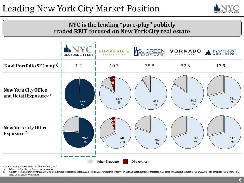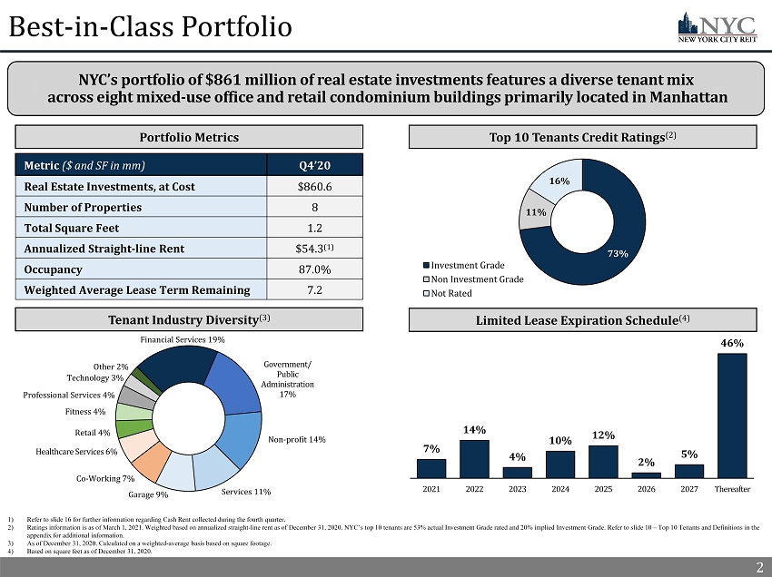 1 Fourth Quarter Highlights High Quality New York City Focused Portfolio x $861 million portfolio of eight high - quality office and retail condominium assets located primarily in Manhattan x High portfolio Occupancy (1) of 87% (2) with a weighted average Remaining Lease Term (1) of 7.2 years x NYC’s top 10 tenants feature a balance of large corporate and government organizations that are 73% Investment Grade (1) rated, increasing the quality and stability of the Company’s revenues (3) x Collected 82% of original fourth quarter Cash Rent (4) across the portfolio and 89% from our top ten tenants x Year over year, NYC’s Remaining Lease Term improved to 7.2 years from 6.8 years as management executed on portfolio leasing i nit iatives, including an attractive early 10 - year lease extension with City National Bank (5) x As of March 1, 2021, NYC also had a forward Leasing Pipeline (1) of 33,216 SF that is expected to provide an annual base rent increase of $1.4 million if these leases commence (2) Proactive Asset Management x Management continues to focus on driving robust leasing activity across the portfolio by executing strategic lease amendments wi th near - term maturing tenants and executing new leases with creditworthy tenants • Executed a short - term lease and an LOI for a five - year lease with a Fortune 50 technology company to lease 15,136 SF at 123 Will iam Street. The short - term lease and the new lease, if executed, is expected to add approximately $800,000 in new annual base rent for five years • In advanced discussions on a five - year lease extension with an Aa2 credit tenant at 123 William Street, which, if a definitive a greement is executed and internal approvals are received, would increase annual straight - line rent by approximately $300,000 (6) • In January, management engaged Cushman & Wakefield as 9 Times Square’s new leasing broker to leverage a leading global broker age firm and generate substantial leasing momentum with creditworthy tenants Attractive Investment Opportunity x After listing on the NYSE in August, NYC became the leading “pure - play” publicly traded REIT focused on New York City real estate x Opportunity for growth as management continues to focus on leasing efforts across the portfolio and evaluate attractive acqui sit ion opportunities caused by short - term market dislocation by the COVID - 19 pandemic x Since Q4'14, portfolio Occupancy has increased from 75% to 87% (2) as management executed on its leasing initiatives by completing new leases, extensions, tenant expansions and asset acquisitions x Management expects that mass vaccine rollout will target a “return to normalcy” after the summer holidays, and support a sign ifi cant uptick in office use and leasing trends in Q4’21 and 2022 Conservative Balance Sheet (7) x Prudent balance sheet with Net Leverage (1) of 37.3% x No debt maturities within the next three years and a weighted average debt maturity of 6.1 years Experienced Management Team x Proven track record with significant public REIT market experience x Fully aligned management structure designed to reward strong operational performance 1) See Definitions in the appendix for a full description. 2) Includes leased space occupied by Knotel, Inc. as of December 31, 2020. In January 2021, Knotel, Inc. filed for bankruptcy an d a ll leases were terminated effective January 31, 2021, representing 71,207 square feet and $3.7 million of annual base rent. G ivi ng effect to this termination, Occupancy as of December 31, 2020 would have been 81%. 3) Refer to slide 10 – Top 10 Tenants and Definitions in the appendix for additional information. 4) Refer to slide 16 – Q4 Cash Rent Collection for additional information. 5) Assumes tenant does not exercise option to terminate extension term after five years (in 2028) upon payment of termination fe e. 6) Refer to slide 12 – Proactive Portfolio Management for additional information. 7) Refer to slide 18 for further information regarding our capital structure and liquidity. 1