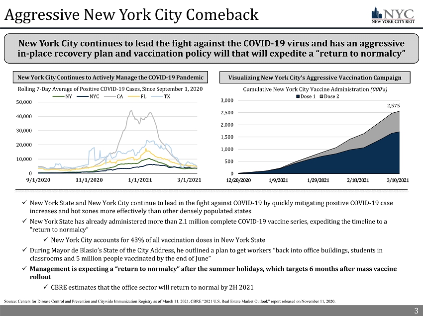 2 Best - in - Class Portfolio Metric ($ and SF in mm) Q4’20 Real Estate Investments, at Cost $860.6 Number of Properties 8 Total Square Feet 1.2 Annualized Straight - line Rent $54.3 (1) Occupancy 87.0% Weighted Average Lease Term Remaining 7.2 1) Refer to slide 16 for further information regarding Cash Rent collected during the fourth quarter. 2) Ratings information is as of March 1, 2021. Weighted based on annualized straight - line rent as of December 31, 2020. NYC’s top 1 0 tenants are 53% actual Investment Grade rated and 20% implied Investment Grade. Refer to slide 10 – Top 10 Tenants and Definitions in the appendix for additional information. 3) As of December 31, 2020. Calculated on a weighted - average basis based on square footage. 4) Based on square feet as of December 31, 2020. 2 7% 14% 4% 10% 12% 2% 5% 46% 2021 2022 2023 2024 2025 2026 2027 Thereafter Financial Services 19% Government/ Public Administration 17% Non - profit 14% Services 11% Garage 9% Co - Working 7% Healthcare Services 6% Retail 4% Fitness 4% Professional Services 4% Technology 3% Other 2% NYC’s portfolio of $861 million of real estate investments features a diverse tenant mix across eight mixed - use office and retail condominium buildings primarily located in Manhattan Top 10 Tenants Credit Ratings (2) Tenant Industry Diversity (3) Limited Lease Expiration Schedule (4) Portfolio Metrics 73% 11% 16% Investment Grade Non Investment Grade Not Rated