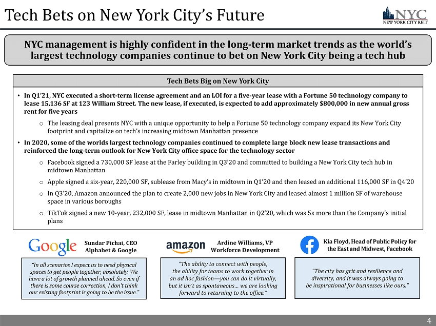 3 Aggressive New York City Comeback 3 New York City Continues to Actively Manage the COVID - 19 Pandemic x New York State and New York City continue to lead in the fight against COVID - 19 by quickly mitigating positive COVID - 19 case increases and hot zones more effectively than other densely populated states x New York State has already administered more than 2.1 million complete COVID - 19 vaccine series, expediting the timeline to a “return to normalcy” x New York City accounts for 43% of all vaccination doses in New York State x During Mayor de Blasio’s State of the City Address, he outlined a plan to get workers “back into office buildings, students i n classrooms and 5 million people vaccinated by the end of June” x Management is expecting a “return to normalcy” after the summer holidays, which targets 6 months after mass vaccine rollout x CBRE estimates that the office sector will return to normal by 2H 2021 New York City continues to lead the fight against the COVID - 19 virus and has an aggressive in - place recovery plan and vaccination policy will that will expedite a “return to normalcy” Visualizing New York City’s Aggressive Vaccination Campaign Source: Centers for Disease Control and Prevention and Citywide Immunization Registry as of March 11, 2021. CBRE “2021 U.S. R eal Estate Market Outlook” report released on November 11, 2020. 0 500 1,000 1,500 2,000 2,500 3,000 12/20/2020 1/9/2021 1/29/2021 2/18/2021 3/10/2021 Cumulative New York City Vaccine Administration (000’s) Dose 1 Dose 2 2,575 0 10,000 20,000 30,000 40,000 50,000 9/1/2020 11/1/2020 1/1/2021 3/1/2021 NY NYC CA FL TX Rolling 7 - Day Average of Positive COVID - 19 Cases, Since September 1, 2020