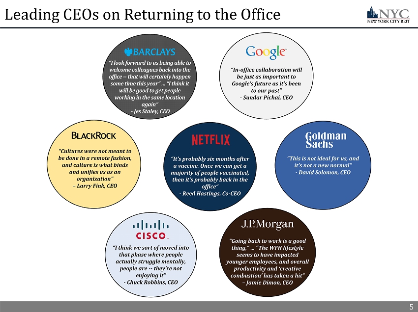 4 Tech Bets on New York City’s Future NYC management is highly confident in the long - term market trends as the world’s largest technology companies continue to bet on New York City being a tech hub 4 “In all scenarios I expect us to need physical spaces to get people together, absolutely. We have a lot of growth planned ahead. So even if there is some course correction, I don't think our existing footprint is going to be the issue.” Sundar Pichai, CEO Alphabet & Google “The ability to connect with people, the ability for teams to work together in an ad hoc fashion — you can do it virtually, but it isn’t as spontaneous… we are looking forward to returning to the office.” Ardine Williams, VP Workforce Development • In Q1’21, NYC executed a short - term license agreement and an LOI for a five - year lease with a Fortune 50 technology company to lease 15,136 SF at 123 William Street. The new lease, if executed, is expected to add approximately $800,000 in new annual gr oss rent for five years o The leasing deal presents NYC with a unique opportunity to help a Fortune 50 technology company expand its New York City footprint and capitalize on tech’s increasing midtown Manhattan presence • In 2020, some of the worlds largest technology companies continued to complete large block new lease transactions and reinforced the long - term outlook for New York City office space for the technology sector o Facebook signed a 730,000 SF lease at the Farley building in Q3’20 and committed to building a New York City tech hub in midtown Manhattan o Apple signed a six - year, 220,000 SF, sublease from Macy’s in midtown in Q1’20 and then leased an additional 116,000 SF in Q4’20 o In Q3’20, Amazon announced the plan to create 2,000 new jobs in New York City and leased almost 1 million SF of warehouse space in various boroughs o TikTok signed a new 10 - year, 232,000 SF, lease in midtown Manhattan in Q2’20, which was 5x more than the Company’s initial plans Tech Bets Big on New York City “The city has grit and resilience and diversity, and it was always going to be inspirational for businesses like ours.” Kia Floyd, Head of Public Policy for the East and Midwest, Facebook