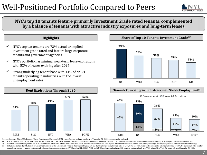 6 Leading New York City Market Position NYC is the leading “pure - play” publicly traded REIT focused on New York City real estate Total Portfolio SF (mm) (1) 6 New York City Office and Retail Exposure (2) New York City Office Exposure (2) Other Exposure Observatory Source: Company and peer metrics as of December 31, 2020 . 1) Reflects total portfolio and not pro rata square feet. 2) All metrics reflect at share ownership. NYC based on annualized straight - line rent. ESRT based on LTM revenue from Observatory a nd annualized rent for all other assets. SLG based on annualized contractual rent. PGRE based on annualized rent at share. VN O based on annualized NOI at share. 1.2 99.1 % 10.2 28.8 32.5 12.9 76.0 % 68. 7% 5.1 % 80.1 % 69.1 % 71.1 % 83.9 % 5.1 % 90.9 % 84.3 % 71.1 %