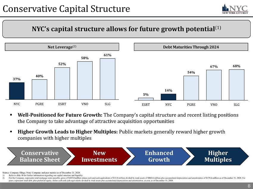 7 Well - Positioned Portfolio Compared to Peers 7 Sources: Company filings; U.S. Bureau of Labor Statistics as of February 5, 2021. Note: Company and peer metrics as of Decemb er 31, 2020 unless otherwise indicated. 1) CAGR from Q4'14 to Q4’20. NYC based on SLR. ESRT and PGRE based on annualized rent. SLG based on annualized contractual cash ren t. VNO based on estimated annualized rent determined using top 30 tenants percent of total annualized rent. 2) Based on annualized straight - line rent as of December 31, 2020. NYC’s top 10 tenants are 53% actual Investment Grade rated and 2 0% implied Investment Grade rated tenants. Peer tenant percentages are only comprised of actual Investment Grade ratings. 3) In September 2020, the U.S. Bureau of Labor Statistics reported that Government, Financial Activities and Agriculture had the th ree lowest unemployment rates of 4.1%, 4.4%, and 5.0% respectively, compared to total unemployment of 7.7%. Unemployment rate s b ased on unemployed persons by industry, not seasonally adjusted. Industry concentration for NYC based on SLR. ESRT, PGRE and VNO base d o n annualized rent. SLG based on contractual cash rent. VNO reflects New York City assets only as of December 31, 2020. Tenants Operating in Industries with Stable Employment (3) Share of Top 10 Tenants Investment Grade (2) Rent Expirations Through 2026 Highlights NYC’s top 10 tenants feature primarily Investment Grade rated tenants, complemented by a balance of tenants with attractive industry exposures and long - term leases 14% 4% 3% 2% 45% 29% 32% 18% 17% 45% 43% 36% 21% 19% PGRE NYC SLG VNO ESRT Government Financial Activities 44% 48% 49% 53% 53% ESRT SLG NYC VNO PGRE 73% 63% 58% 55% 51% NYC VNO SLG ESRT PGRE x NYC’s top ten tenants are 73% actual or implied investment grade rated and feature large corporate tenants and government agencies x NYC’s portfolio has minimal near - term lease expirations with 52% of leases expiring after 2026 x Strong underlying tenant base with 43% of NYC’s tenants operating in industries with the lowest unemployment rates