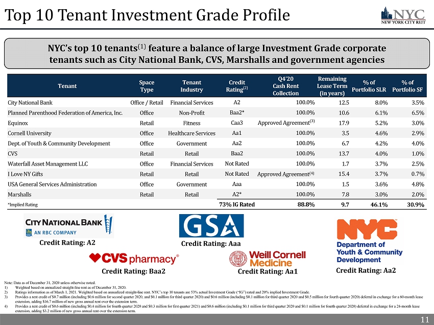 10 10 Detailed Property Summary Note: Data as of December 31, 2020. 1) Includes leased space occupied by Knotel, Inc. In January 2021, Knotel filed for bankruptcy and all leases were terminated ef fec tive January 31, 2021. If Knotel was not included in this calculation as of December 31, 2020, occupancy for 9 Times Square a nd 123 Williams Street would have been 58% and 84%, respectively, and our combined occupancy would have been 81%. Portfolio Real Estate Assets, at cost ($ mm) Occupancy (1) Remaining Lease Term (in years) % of Annualized Straight - Line Rent % of Portfolio Square Feet 123 William Street $286.4 90% 5.7 37% 47% _ 1140 Avenue of the Americas 178.1 79% 6.9 28% 21% _ 9 Times Square 186.8 79% 7.7 14% 14% _ 196 Orchard Street 89.3 100% 14.0 12% 5% _ 400 E. 67th Street 77.1 100% 3.9 6% 5% _ 8713 Fifth Avenue 16.3 100% 4.5 2% 2% _ 200 Riverside Blvd. - ICON 20.2 100% 16.8 0% 5% _ 421 W. 54th Street – Hit Factory 6.5 0% 0.0 0% 1% _ Total Portfolio $860.6 87% 7.2 100% 100% _ Note: Map shows seven properties located in Manhattan. Medical office building in Brooklyn not pictured. NYC’s portfolio is diversified across eight mixed - use office and retail condominium buildings primarily located in Manhattan
