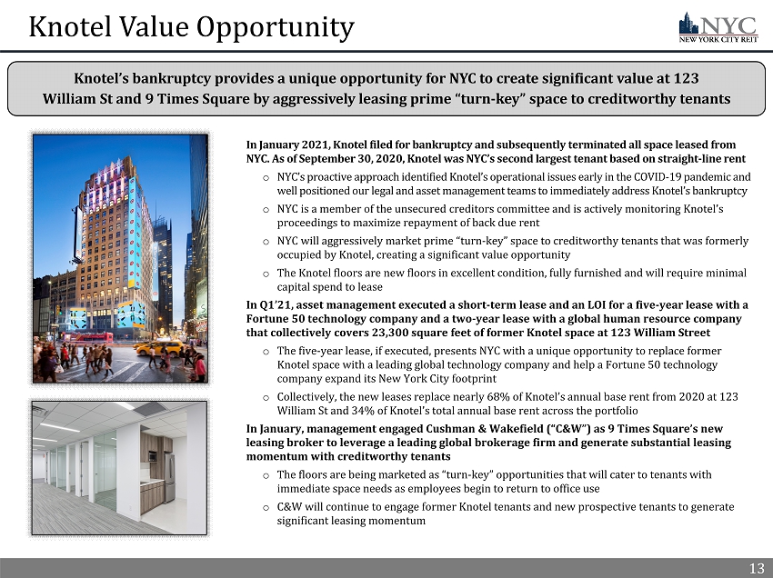 12 12 Asset management has proactively executed lease extensions with near - term maturing tenants, mutually beneficial lease amendments and new leases with creditworthy tenants Proactive Portfolio Management Prior Lease New Lease Moody’s Credit Rating Aa2 Aa2 Square Feet 40,307 45,313 Lease Expiration year 2022 2027 Remaining Lease Term 1.6 Years 5.0 Years 12 5 - Year Lease Extension with an Aa2 Credit Tenant (1) MakeSpace Amendment Captures Past Due Cash Rent x Five - year lease extension with a strong creditworthy tenant x Lease amendment captures all of cash rent in arrears and 2021 Cash Rent due Leasing Commentary x In advanced discussions on a five - year lease extension with an Aa2 credit tenant at 123 William Street, which, if a definitive agreement is executed and internal approvals are received, would increase annual straight - line rent by approximately $300,000 (1) x Executed a lease amendment with MakeSpace at 123 William Street that recaptured all of the past due and future 2021 Cash Rent due in exchange for a 2 - year reduction in lease term x Executed a short - term lease and an LOI for a five - year lease with a Fortune 50 technology company and a two - year lease with a global human resource company that collectively cover 23,300 square feet of former Knotel space at 123 William Street x Asset management continues to actively negotiate new leases with creditworthy tenants and mutually beneficial lease amendment s Prior Lease Amended Lease (2) Square Feet 12,658 12,658 Lease Expiration 7/31/2025 7/31/2023 Payment Status Past Due Prepaid 2021 Past Due Rent ($ in 000) $533 None 1) A final amendment is subject to negotiation and execution of a definitive agreement as well as any internal approvals that ma y b e needed by the tenant for which there can be no assurance. 2) The lease amendment provided a two - year term reduction and 25% discount on 2021 cash rent due in exchange for all of the cash re nt in arrears, cash rent due in 2021 and replacement of security in the form of a letter of credit.