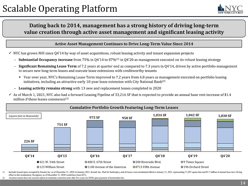 13 Knotel’s bankruptcy provides a unique opportunity for NYC to create significant value at 123 William St and 9 Times Square by aggressively leasing prime “turn - key” space to creditworthy tenants Knotel Value Opportunity 13 In January 2021, Knotel filed for bankruptcy and subsequently terminated all space leased from NYC. As of September 30, 2020, Knotel was NYC’s second largest tenant based on straight - line rent o NYC’s proactive approach identified Knotel’s operational issues early in the COVID - 19 pandemic and well positioned our legal and asset management teams to immediately address Knotel’s bankruptcy o NYC is a member of the unsecured creditors committee and is actively monitoring Knotel’s proceedings to maximize repayment of back due rent o NYC will aggressively market prime “turn - key” space to creditworthy tenants that was formerly occupied by Knotel, creating a significant value opportunity o The Knotel floors are new floors in excellent condition, fully furnished and will require minimal capital spend to lease In Q1’21, asset management executed a short - term lease and an LOI for a five - year lease with a Fortune 50 technology company and a two - year lease with a global human resource company that collectively covers 23,300 square feet of former Knotel space at 123 William Street o The five - year lease, if executed, presents NYC with a unique opportunity to replace former Knotel space with a leading global technology company and help a Fortune 50 technology company expand its New York City footprint o Collectively, the new leases replace nearly 68% of Knotel’s annual base rent from 2020 at 123 William St and 34% of Knotel’s total annual base rent across the portfolio In January, management engaged Cushman & Wakefield (“C&W”) as 9 Times Square’s new leasing broker to leverage a leading global brokerage firm and generate substantial leasing momentum with creditworthy tenants o The floors are being marketed as “turn - key” opportunities that will cater to tenants with immediate space needs as employees begin to return to office use o C&W will continue to engage former Knotel tenants and new prospective tenants to generate significant leasing momentum