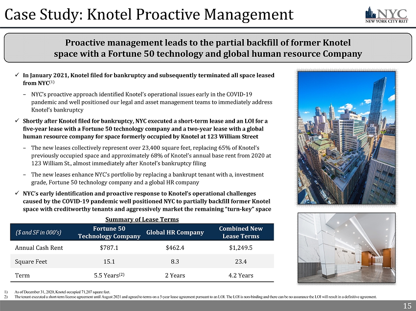 14 14 Q4'14 Q4'15 Q4'16 Q4'17 Q4'18 Q4'19 Q4'20 421 W. 54th Street 400 E. 67th Street 200 Riverside Blvd. 9 Times Square 123 William Street 1140 Avenue of the Americas 8713 Fifth Avenue 196 Orchard Street Scalable Operating Platform Dating back to 2014, management has a strong history of driving long - term value creation through active asset management and significant leasing activity Cumulative Portfolio Growth Featuring Long - Term Leases Active Asset Management Continues to Drive Long - Term Value Since 2014 x NYC has grown NOI since Q4'14 by way of asset acquisitions, robust leasing activity and tenant expansion projects – Substantial Occupancy increase from 75% in Q4'14 to 87% (1) in Q4’20 as management executed on its robust leasing strategy – Significant Remaining Lease Term of 7.2 years at quarter end as compared to 7.3 years in Q4'14, driven by active portfolio management to secure new long - term leases and execute lease extensions with creditworthy tenants ▪ Year over year, NYC’s Remaining Lease Term improved to 7.2 years from 6.8 years as management executed on portfolio leasing initiatives, including an attractive early 10 - year lease extension with City National Bank (2) – Leasing activity remains strong with 13 new and replacement leases completed in 2020 x As of March 1, 2021, NYC also had a forward Leasing Pipeline of 33,216 SF that is expected to provide an annual base rent inc rea se of $1.4 million if these leases commence (1) 226 SF 751 SF 975 SF 958 SF 1,034 SF 1,042 SF 1,030 SF 1) Includes leased space occupied by Knotel, Inc. as of December 31, 2020. In January 2021, Knotel, Inc. filed for bankruptcy an d a ll leases were terminated effective January 31, 2021, representing 71,207 square feet and $3.7 million of annual base rent. G ivi ng effect to this termination, Occupancy as of December 31, 2020 would have been 81%. 2) Assumes tenant does not exercise option to terminate extension term after five years (in 2028) upon payment of termination fe e. (square feet in thousands)