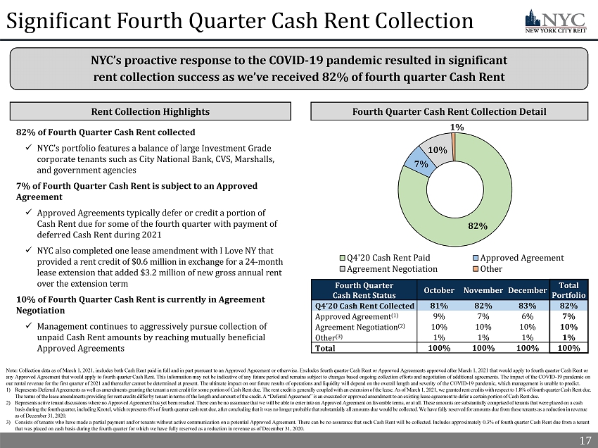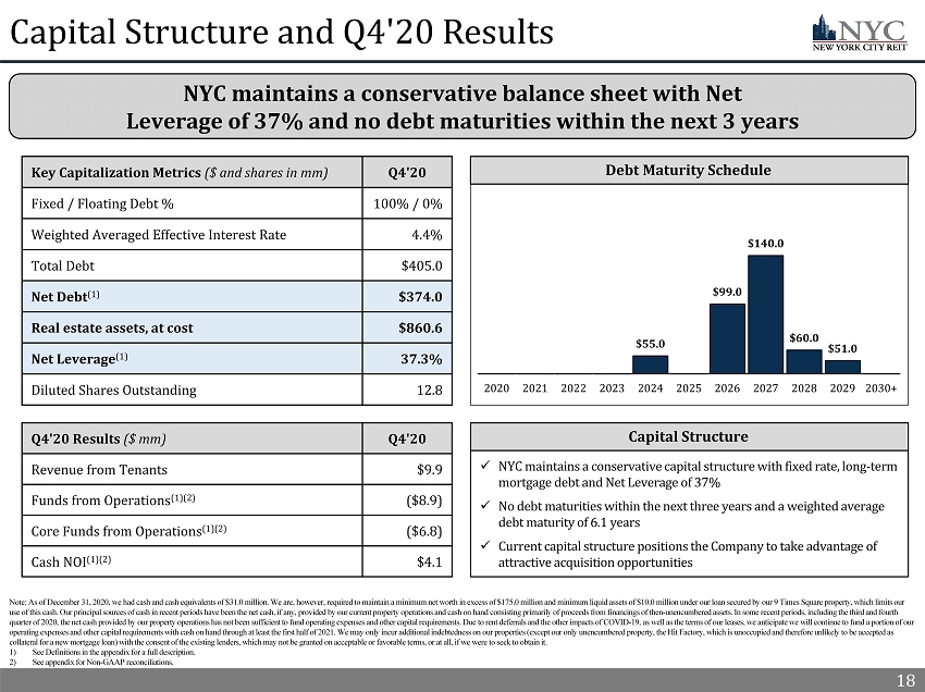 17 82% 7% 10% 1% Q4'20 Cash Rent Paid Approved Agreement Agreement Negotiation Other Significant Fourth Quarter Cash Rent Collection Fourth Quarter Cash Rent Status October November December Total Portfolio _ Q4'20 Cash Rent Collected 81% 82% 83% 82% _ Approved Agreement (1) 9% 7% 6% 7% _ Agreement Negotiation (2) 10% 10% 10% 10% _ Other (3) 1% 1% 1% 1% _ Total 100% 100% 100% 100% 17 NYC’s proactive response to the COVID - 19 pandemic resulted in significant rent collection success as we’ve received 82% of fourth quarter Cash Rent Rent Collection Highlights Fourth Quarter Cash Rent Collection Detail 82% of Fourth Quarter Cash Rent collected x NYC’s portfolio features a balance of large Investment Grade corporate tenants such as City National Bank, CVS, Marshalls, and government agencies 7% of Fourth Quarter Cash Rent is subject to an Approved Agreement x Approved Agreements typically defer or credit a portion of Cash Rent due for some of the fourth quarter with payment of deferred Cash Rent during 2021 x NYC also completed one lease amendment with I Love NY that provided a rent credit of $0.6 million in exchange for a 24 - month lease extension that added $3.2 million of new gross annual rent over the extension term 10% of Fourth Quarter Cash Rent is currently in Agreement Negotiation x Management continues to aggressively pursue collection of unpaid Cash Rent amounts by reaching mutually beneficial Approved Agreements Note: Collection data as of March 1, 2021, includes both Cash Rent paid in full and in part pursuant to an Approved Agreement or otherwise. Excludes fourth quarter Cash Rent or Approved Agreements approved after March 1, 2021 that would apply to fourth q ua rter Cash Rent or any Approved Agreement that would apply to fourth quarter Cash Rent. This information may not be indicative of any future per iod and remains subject to changes based ongoing collection efforts and negotiation of additional agreements. The impact of the C OV ID - 19 pandemic on our rental revenue for the first quarter of 2021 and thereafter cannot be determined at present. The ultimate impact on our f utu re results of operations and liquidity will depend on the overall length and severity of the COVID - 19 pandemic, which management is unable to predict. 1) Represents Deferral Agreements as well as amendments granting the tenant a rent credit for some portion of Cash Rent due. The re nt credit is generally coupled with an extension of the lease. As of March 1, 2021, we granted rent credits with respect to 1 .8% of fourth quarter Cash Rent due. The terms of the lease amendments providing for rent credits differ by tenant in terms of the length and amount of the credit . A “Deferral Agreement” is an executed or approved amendment to an existing lease agreement to defer a certain portion of Cash R en t due. 2) Represents active tenant discussions where no Approved Agreement has yet been reached. There can be no assurance that we will be able to enter into an Approved Agreement on favorable terms, or at all. These amounts are substantially comprised of tenants th at were placed on a cash basis during the fourth quarter, including Knotel, which represents 6% of fourth quarter cash rent due, after concluding that it was no longer probable that substantially all amounts due would be collected. We have fully reserved for amounts due from the se tenants as a reduction in revenue as of December 31, 2020. 3) Consists of tenants who have made a partial payment and/or tenants without active communication on a potential Approved Agree men t. There can be no assurance that such Cash Rent will be collected. Includes approximately 0.3% of fourth quarter Cash Rent d ue from a tenant that was placed on cash basis during the fourth quarter for which we have fully reserved as a reduction in revenue as of Dece mbe r 31, 2020.