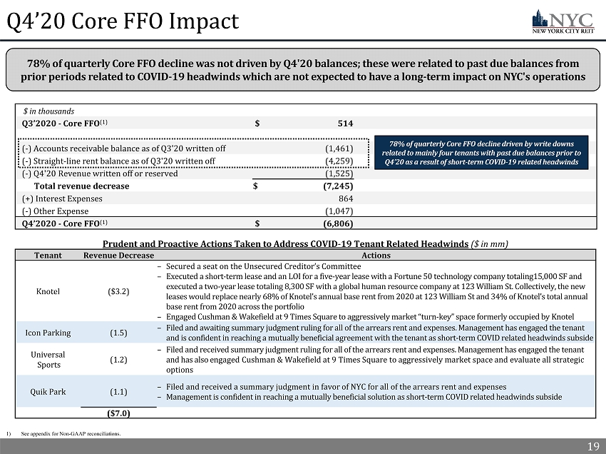 18 18 Capital Structure and Q4'20 Results Note: As of December 31, 2020, we had cash and cash equivalents of $31.0 million. We are, however, required to maintain a min imu m net worth in excess of $175.0 million and minimum liquid assets of $10.0 million under our loan secured by our 9 Times Squa re property, which limits our use of this cash. Our principal sources of cash in recent periods have been the net cash, if any, provided by our current pro per ty operations and cash on hand consisting primarily of proceeds from financings of then - unencumbered assets. In some recent peri ods, including the third and fourth quarter of 2020, the net cash provided by our property operations has not been sufficient to fund operating expenses and othe r c apital requirements. Due to rent deferrals and the other impacts of COVID - 19, as well as the terms of our leases, we anticipate we will continue to fund a portion of our operating expenses and other capital requirements with cash on hand through at least the first half of 2021. We may only incu r a dditional indebtedness on our properties (except our only unencumbered property, the Hit Factory, which is unoccupied and the ref ore unlikely to be accepted as collateral for a new mortgage loan) with the consent of the existing lenders, which may not be granted on acceptable or favor abl e terms, or at all, if we were to seek to obtain it. 1) See Definitions in the appendix for a full description. 2) See appendix for Non - GAAP reconciliations. NYC maintains a conservative balance sheet with Net Leverage of 37% and no debt maturities within the next 3 years Capital Structure x NYC maintains a conservative capital structure with fixed rate, long - term mortgage debt and Net Leverage of 37% x No debt maturities within the next three years and a weighted average debt maturity of 6.1 years x Current capital structure positions the Company to take advantage of attractive acquisition opportunities Q4'20 Results ($ mm) Q4'20 Revenue from Tenants $9.9 Funds from Operations (1)(2) ($8.9) Core Funds from Operations (1)(2) ($6.8) Cash NOI (1)(2) $4.1 Key Capitalization Metrics ($ and shares in mm) Q4'20 Fixed / Floating Debt % 100% / 0% Weighted Averaged Effective Interest Rate 4.4% Total Debt $405.0 Net Debt (1) $374.0 Real estate assets, at cost $860.6 Net Leverage (1) 37.3% Diluted Shares Outstanding 12.8 Debt Maturity Schedule $55.0 $99.0 $140.0 $60.0 $51.0 $40.0 $60.0 $80.0 $100.0 $120.0 $140.0 $160.0 $180.0 2020 2021 2022 2023 2024 2025 2026 2027 2028 2029 2030+
