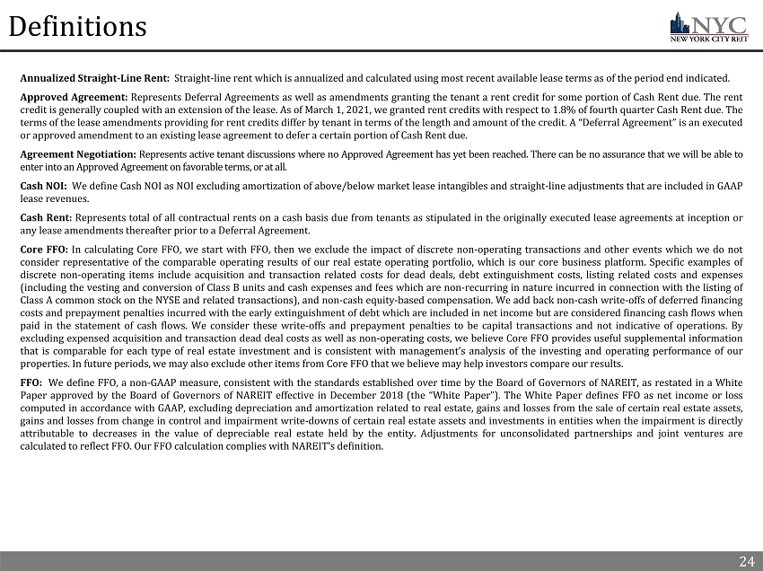 24 24 Definitions Annualized Straight - Line Rent : Straight - line rent which is annualized and calculated using most recent available lease terms as of the period end indicated . Approved Agreement : Represents Deferral Agreements as well as amendments granting the tenant a rent credit for some portion of Cash Rent due . The rent credit is generally coupled with an extension of the lease . As of March 1 , 2021 , we granted rent credits with respect to 1 . 8 % of fourth quarter Cash Rent due . The terms of the lease amendments providing for rent credits differ by tenant in terms of the length and amount of the credit . A “Deferral Agreement” is an executed or approved amendment to an existing lease agreement to defer a certain portion of Cash Rent due . Agreement Negotiation : Represents active tenant discussions where no Approved Agreement has yet been reached . There can be no assurance that we will be able to enter into an Approved Agreement on favorable terms, or at all . Cash NOI : We define Cash NOI as NOI excluding amortization of above/below market lease intangibles and straight - line adjustments that are included in GAAP lease revenues . Cash Rent : Represents total of all contractual rents on a cash basis due from tenants as stipulated in the originally executed lease agreements at inception or any lease amendments thereafter prior to a Deferral Agreement . Core FFO : In calculating Core FFO, we start with FFO, then we exclude the impact of discrete non - operating transactions and other events which we do not consider representative of the comparable operating results of our real estate operating portfolio, which is our core business platform . Specific examples of discrete non - operating items include acquisition and transaction related costs for dead deals, debt extinguishment costs, listing related costs and expenses (including the vesting and conversion of Class B units and cash expenses and fees which are non - recurring in nature incurred in connection with the listing of Class A common stock on the NYSE and related transactions), and non - cash equity - based compensation . We add back non - cash write - offs of deferred financing costs and prepayment penalties incurred with the early extinguishment of debt which are included in net income but are considered financing cash flows when paid in the statement of cash flows . We consider these write - offs and prepayment penalties to be capital transactions and not indicative of operations . By excluding expensed acquisition and transaction dead deal costs as well as non - operating costs, we believe Core FFO provides useful supplemental information that is comparable for each type of real estate investment and is consistent with management’s analysis of the investing and operating performance of our properties . In future periods, we may also exclude other items from Core FFO that we believe may help investors compare our results . FFO : We define FFO, a non - GAAP measure, consistent with the standards established over time by the Board of Governors of NAREIT, as restated in a White Paper approved by the Board of Governors of NAREIT effective in December 2018 (the “White Paper”) . The White Paper defines FFO as net income or loss computed in accordance with GAAP, excluding depreciation and amortization related to real estate, gains and losses from the sale of certain real estate assets, gains and losses from change in control and impairment write - downs of certain real estate assets and investments in entities when the impairment is directly attributable to decreases in the value of depreciable real estate held by the entity . Adjustments for unconsolidated partnerships and joint ventures are calculated to reflect FFO . Our FFO calculation complies with NAREIT’s definition .