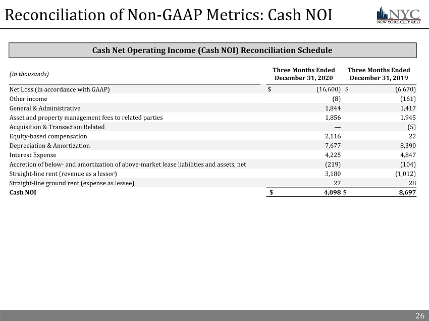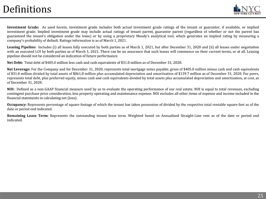 25 25 Definitions Investment Grade : As used herein, investment grade includes both actual investment grade ratings of the tenant or guarantor, if available, or implied investment grade . Implied investment grade may include actual ratings of tenant parent, guarantor parent (regardless of whether or not the parent has guaranteed the tenant’s obligation under the lease) or by using a proprietary Moody’s analytical tool, which generates an implied rating by measuring a company’s probability of default . Ratings information is as of March 1 , 2021 . Leasing Pipeline : Includes ( i ) all leases fully executed by both parties as of March 1 , 2021 , but after December 31 , 2020 and (ii) all leases under negotiation with an executed LOI by both parties as of March 1 , 2021 . There can be no assurance that such leases will commence on their current terms, or at all . Leasing pipeline should not be considered an indication of future performance . Net Debt : Total debt of $ 405 . 0 million less cash and cash equivalents of $ 31 . 0 million as of December 31 , 2020 . Net Leverage : For the Company and for December 31 , 2020 , represents total mortgage notes payable, gross of $ 405 . 0 million minus cash and cash equivalents of $ 31 . 0 million divided by total assets of $ 861 . 8 million plus accumulated depreciation and amortization of $ 139 . 7 million as of December 31 , 2020 . For peers, represents total debt, plus preferred equity, minus cash and cash equivalents divided by total assets plus accumulated depreciation and amortization, at cost, as of December 31 , 2020 . NOI : Defined as a non - GAAP financial measure used by us to evaluate the operating performance of our real estate . NOI is equal to total revenues, excluding contingent purchase price consideration, less property operating and maintenance expense . NOI excludes all other items of expense and income included in the financial statements in calculating net (loss) . Occupancy : Represents percentage of square footage of which the tenant has taken possession of divided by the respective total rentable square feet as of the date or period end indicated . Remaining Lease Term : Represents the outstanding tenant lease term . Weighted based on Annualized Straight - Line rent as of the date or period end indicated .