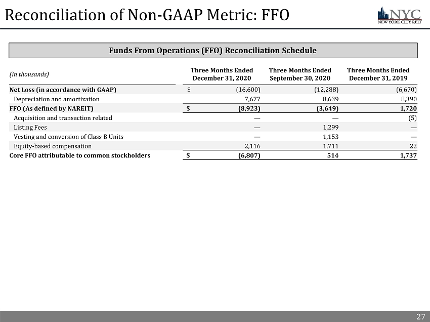 26 26 Reconciliation of Non - GAAP Metrics: Cash NOI (in thousands) Three Months Ended December 31, 2020 Three Months Ended December 31, 2019 Net Loss (in accordance with GAAP) $ (16,600) $ (6,670) Other income (8) (161) General & Administrative 1,844 1,417 Asset and property management fees to related parties 1,856 1,945 Acquisition & Transaction Related — (5) Equity - based compensation 2,116 22 Depreciation & Amortization 7,677 8,390 Interest Expense 4,225 4,847 Accretion of below - and amortization of above - market lease liabilities and assets, net (219) (104) Straight - line rent (revenue as a lessor) 3,180 (1,012) Straight - line ground rent (expense as lessee) 27 28 Cash NOI $ 4,098 $ 8,697 Cash Net Operating Income (Cash NOI) Reconciliation Schedule