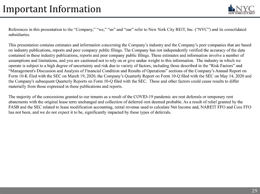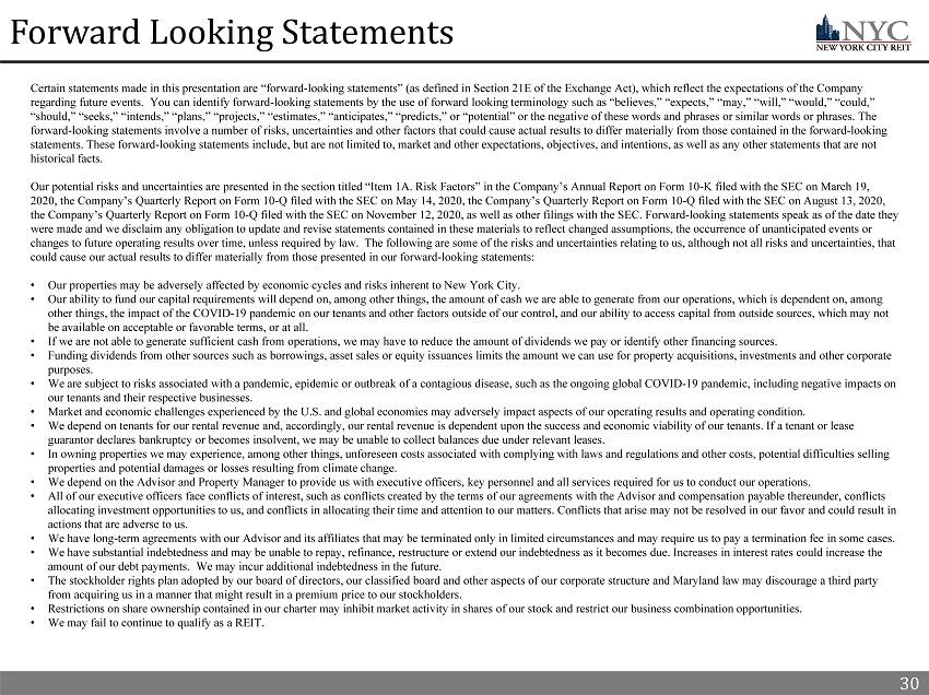 29 29 Important Information References in this presentation to the “Company,” “we,” “us” and “our” refer to New York City REIT, Inc. (“NYC”) and its cons oli dated subsidiaries. This presentation contains estimates and information concerning the Company’s industry and the Company’s peer companies that are based on industry publications, reports and peer company public filings. The Company has not independently verified the accuracy of th e data contained in these industry publications, reports and peer company public filings. These estimates and information involve a num ber of assumptions and limitations, and you are cautioned not to rely on or give undue weight to this information. The industry in whi ch we operate is subject to a high degree of uncertainty and risk due to variety of factors, including those described in the “Risk Fa ctors” and “Management's Discussion and Analysis of Financial Condition and Results of Operations” sections of the Company’s Annual Repo rt on Form 10 - K filed with the SEC on March 19, 2020, the Company’s Quarterly Report on Form 10 - Q filed with the SEC on May 14, 2020 a nd the Company's subsequent Quarterly Reports on Form 10 - Q filed with the SEC. These and other factors could cause results to diff er materially from those expressed in these publications and reports. The majority of the concessions granted to our tenants as a result of the COVID - 19 pandemic are rent deferrals or temporary rent abatements with the original lease term unchanged and collection of deferred rent deemed probable. As a result of relief gran ted by the FASB and the SEC related to lease modification accounting, rental revenue used to calculate Net Income and, NAREIT FFO and Co re FFO has not been, and we do not expect it to be, significantly impacted by these types of deferrals.