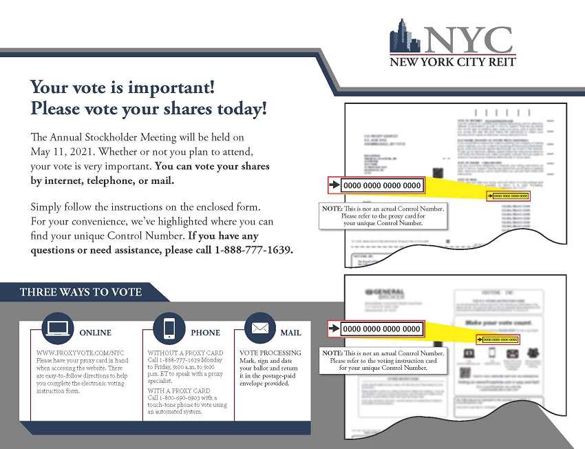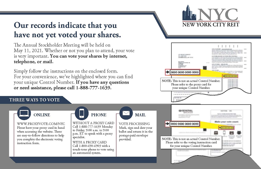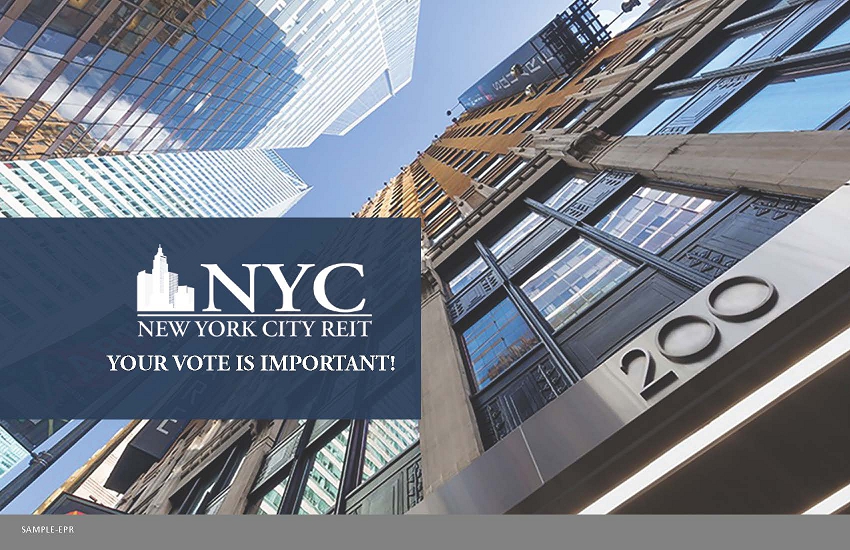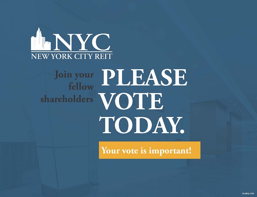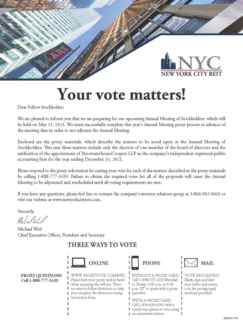 The proxy solicitor to New York City REIT, Inc. (the “Company”) is expected to mail, email, or otherwise disseminate the following materials in connection with the Company’s 2021 annual meeting of stockholders.