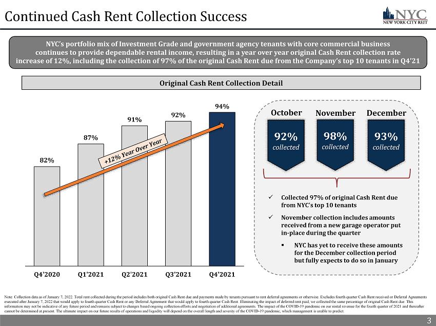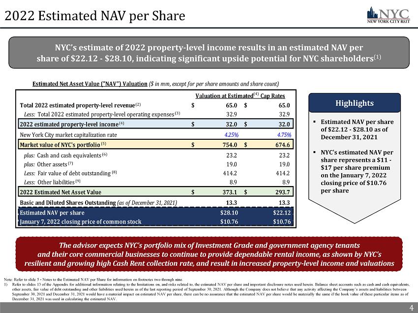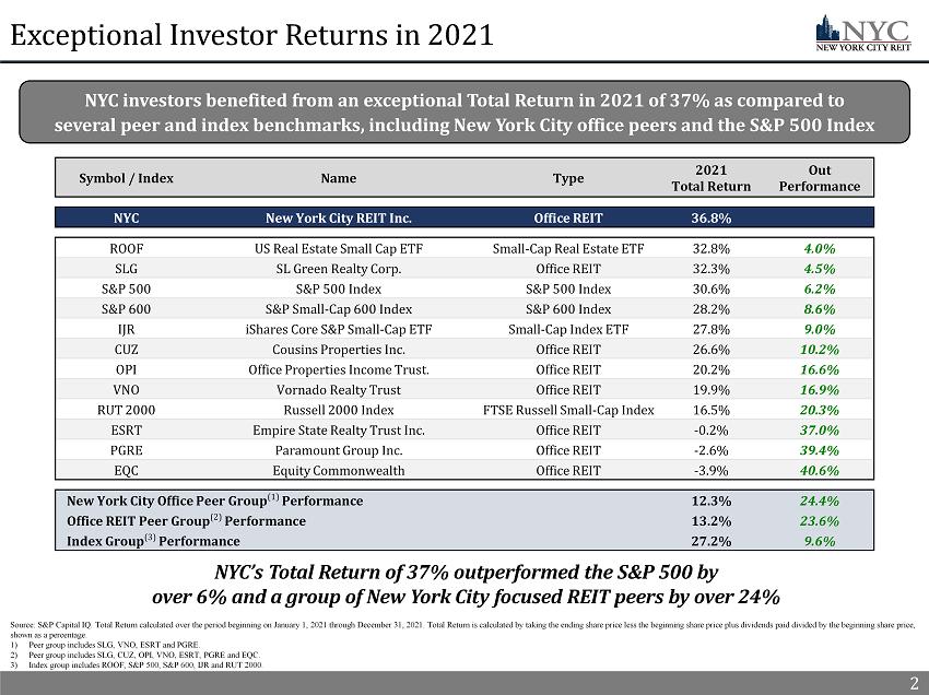 1 NYC’s Board of Directors, led by Elizabeth Tuppeny, in conjunction with the advisor, executed on several initiatives throughout the COVID - 19 pandemic in 2020 and 2021 by utilizing the full resources of the advisor’s platform. Together, the Board and the advisor mitigated adverse impacts from the COVID - 19 pandemic by focusing on proactive asset management, increasing original Cash Rent (1)(2) collection rates and completing new leasing activity. As a result, NYC shareholders benefited from a 37% Total Return (1)(3) in 2021. NYC estimates that its NAV per share as of December 31, 2021 ranged from $22.12 - $28.10 (4) 2021 – Year in Review 1 2021 Highlights ▪ In Q1’21, Knotel, a former top 10 tenant, filed for bankruptcy and terminated all their leased space with NYC x NYC entered into new leases replacing 58% of the square feet and 53% of the Annualized Straight - line Rent (1) formerly derived from Knotel ▪ In Q4’21, NYC executed a termination agreement with Icon Parking and Quik Park, two non - compliant tenants, and immediately backfilled the space with a new operator x The new operator, City Parking, began paying in full the new original Cash Rent due under the license agreement in November 2021 ▪ Through Q3’21, NYC completed 12 new leases in 2021, totaling over 86,000 square feet and $4.3 million of Annualized Straight - line Rent x NYC has added credit - worthy, rent - paying tenants to its portfolio in 2021, including a fortune 50 technology company and a publicly traded, Aa1 implied Investment Grade (1) rated e - commerce technology company ▪ Forward Leasing Pipeline (1) of 21,700 SF for Q3’21 that included one lease executed shortly after the third quarter and two executed LOIs x The Leasing Pipeline is expected to increase portfolio Occupancy (1) to 87% and Occupancy at 9 Times Square by 5% ▪ NYC outperformed the S&P 500 by over 6% and a group of New York City focused REIT peers by over 24% (3) x NYC 2021 Total Return of 37% x New York City focused REIT peer performance of 12% ▪ NYC’s estimate of 2022 property - level income results in an estimated NAV per share of $22.12 - $28.10, indicating further significant upside potential for NYC shareholders (4) x 2022 estimated NAV per share represents a $11 - $17 per share premium on the January 7, 2022 closing price Proactive Asset and Property Management Successful Navigation Throughout COVID - 19 Impactful Leasing Activity Strong 2021 Shareholder Return (3)(4) ▪ Since Q4’20 and through Q4’21, NYC increased its original Cash Rent collection rate by 12% to 94% x Q4’21 portfolio original Cash Rent collection of 94% x 97% of original Cash Rent collection from NYC’s top 10 tenants in Q4’21 ▪ Diligently and proactively communicated with tenants to help them navigate the COVID - 19 pandemic and mitigate adverse economic impacts x NYC collected 100% of the deferred rent due in Q3’21 and Q4’21 that was subject to an Approved Agreement (1) 1) See appendix for a full description of capitalized terms. 2) Refer to slide 3 - Continued Cash Rent Collection Success for additional information. 3) Refer to slide 2 - Exceptional Investor Returns in 2021 for additional information. 4) Refer to slide 4 - 2022 Estimated NAV per Share for additional information and slide 13 of the Appendix for additional informati on relating to limitations on, and risks related to, the estimated NAV per share.
