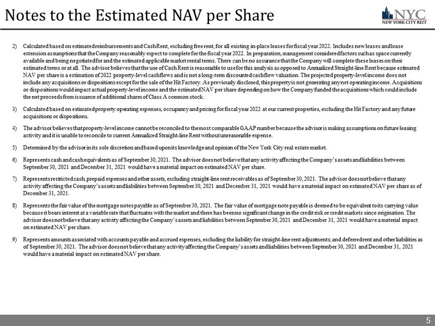4 2022 Estimated NAV per Share 4 NYC’s estimate of 2022 property - level income results in an estimated NAV per share of $22.12 - $28.10, indicating significant upside potential for NYC shareholders (1) Note: Refer to slide 5 - Notes to the Estimated NAV per Share for information on footnotes two through nine. 1) Refer to slides 13 of the Appendix for additional information relating to the limitations on, and risks related to, the estim ate d NAV per share and important disclosure notes used herein. Balance sheet accounts such as cash and cash equivalents, other assets, fair value of debt outstanding and other liabilities used herein as of the last reporting period of September 3 0, 2021. Although the Company does not believe that any activity affecting the Company’s assets and liabilities between September 30, 2021 and December 31, 2021 would have a material impact on estimated NAV per share, there can be no assurance t hat the estimated NAV per share would be materially the same if the book value of these particular items as of December 31, 2021 was used in calculating the estimated NAV. Estimated Net Asset Value ("NAV") Valuation ($ in mm, except for per share amounts and share count) Total 2022 estimated property-level revenue 65.0$ 65.0$ Less: Total 2022 estimated property-level operating expenses 32.9 32.9 2022 estimated property-level income 32.0$ 32.0$ New York City market capitalization rate 4.25% 4.75% Market value of NYC's portfolio 754.0$ 674.6$ plus: Cash and cash equivalents 23.2 23.2 plus: Other assets 19.0 19.0 Less: Fair value of debt outstanding 414.2 414.2 Less: Other liabilities 8.9 8.9 2022 Estimated Net Asset Value 373.1$ 293.7$ Basic and Diluted Shares Outstanding (as of December 31, 2021) 13.3 13.3 Estimated NAV per share $28.10 $22.12 January 7, 2022 closing price of common stock $10.76 $10.76 Valuation at Estimated Cap Rates ▪ Estimated NAV per share of $22.12 - $28.10 as of December 31, 2021 ▪ NYC’s estimated NAV per share represents a $11 - $17 per share premium on the January 7, 2022 closing price of $10.76 per share Highlights The advisor expects NYC’s portfolio mix of Investment Grade and government agency tenants and their core commercial businesses to continue to provide dependable rental income, as shown by NYC’s resilient and growing high Cash Rent collection rate, and result in increased property - level income and valuations (2) (3) (6) (7) (8) (9) (4) (5) (4)