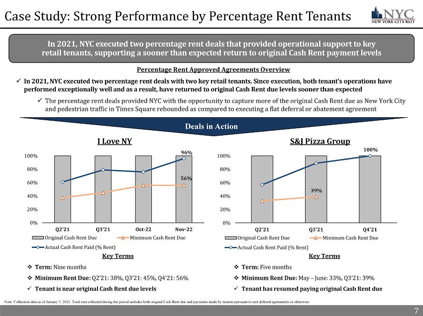 6 33% 45% 58% Through the third quarter, NYC completed 12 new leases that totaled over 86,000 square feet, including 41,000 square feet of Knotel replacement leases and $4.3 million of Annualized Straight - line Rent. NYC also developed a 21,700 square foot forward Leasing Pipeline (1) that is expected to increase Occupancy to 87% from 85% Proactive Asset Management New Lease Replacement (2) (Portfolio | Building) Building 123 Williams Street Credit Rating Aaa Bankrupt Square Feet 15,136 21% | 42% Annual SLR ($ in 000) $787.1 21% | 40% Remaining Lease Term (3) 5 Years N/A 6 Knotel Replacement Lease With Fortune 50 Company Proactive Replacement of Space Terminated by Knotel (2) 2021 Leasing Highlights x NYC swiftly and proactively navigated the New York City leasing market, bringing in credit - worthy and rent - paying tenants on attractive terms ▪ NYC also executed several lease renewals throughout 2021, including a 5 - year lease extension in Q4’21 with an Aa2 credit rated tenant that increased the Annualized Straight - line Rent from the tenant by $0.3 million x NYC actively marketed turn - key space formerly occupied by Knotel, replacing over half of the space through Q3’21 with credit - worthy rent - paying tenants ▪ NYC is working on several new leases for space formerly leased by Knotel at 9 Times Square and 123 Williams Street Knotel Replacement Lease With E - Commerce Company 1) Amounts included in 2022 estimated property - level revenue, expenses and income. Refer to slide 4 for additional information and slides 12 and 13 of the Appendix for additional information relating to the limitations on, and risks related to, the estimat ed NAV per share and important disclosure notes. 2) As of December 31, 2020, Knotel occupied 71 ,207 square feet, totaled $3.9 million of Annualized Straight - line Rent and had 7.8 years of Remaining Lease Term. 3) See Appendix for a full description of capitalized terms. Knotel Termination Replacement Leases 0 SF shown in 000’s New Lease Replacement (2) (Portfolio | Building) Building 9 Times Square Credit Rating Aa1 (implied) Bankrupt Square Feet 8,800 12% | 25% Annual SLR ($ in 000) $439.0 11% | 22% Remaining Lease Term (3) 5 Years N/A