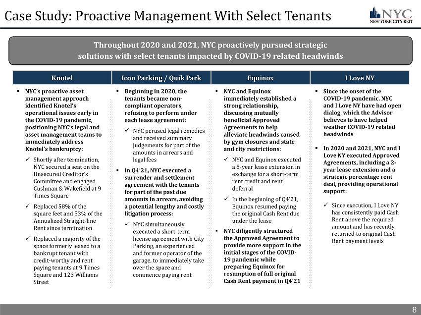 7 Percentage Rent Approved Agreements Overview x In 2021, NYC executed two percentage rent deals with two key retail tenants. Since execution, both tenant’s operations have performed exceptionally well and as a result, have returned to original Cash Rent due levels sooner than expected x The percentage rent deals provided NYC with the opportunity to capture more of the original Cash Rent due as New York City and pedestrian traffic in Times Square rebounded as compared to executing a flat deferral or abatement agreement 7 56% 96% 0% 20% 40% 60% 80% 100% Q2'21 Q3'21 Oct-22 Nov-22 I Love NY Original Cash Rent Due Minimum Cash Rent Due Actual Cash Rent Paid (% Rent) Deals in Action 39% 100% 0% 20% 40% 60% 80% 100% Q2'21 Q3'21 Q4'21 S&J Pizza Group Original Cash Rent Due Minimum Cash Rent Due Actual Cash Rent Paid (% Rent) Key Terms □ Term: Nine months □ Minimum Rent Due: Q2’21: 38%, Q3’21: 45%, Q4’21: 56% x Tenant is near original Cash Rent due levels Key Terms □ Term: Five months □ Minimum Rent Due: May – June: 33%, Q3’21: 39% x Tenant has resumed paying original Cash Rent due Note: Collection data as of January 7, 2021. Total rent collected during the period includes both original Cash Rent due and pay ments made by tenants pursuant to rent deferral agreements or otherwise. In 2021, NYC executed two percentage rent deals that provided operational support to key retail tenants, supporting a sooner than expected return to original Cash Rent payment levels Case Study: Strong Performance by Percentage Rent Tenants