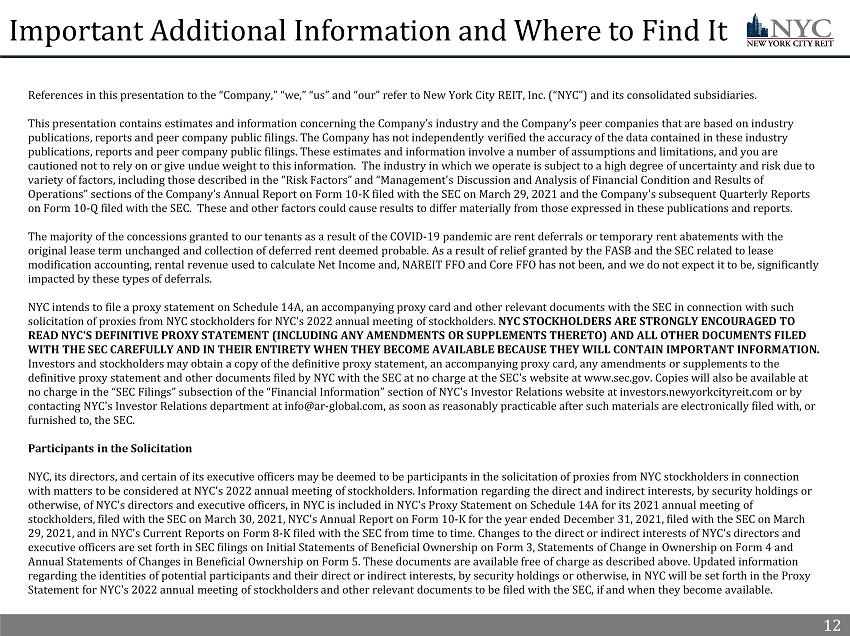 12 Important Additional Information and Where to Find It References in this presentation to the “Company,” “we,” “us” and “our” refer to New York City REIT, Inc. (“NYC”) and its cons oli dated subsidiaries. This presentation contains estimates and information concerning the Company’s industry and the Company’s peer companies that are based on industry publications, reports and peer company public filings. The Company has not independently verified the accuracy of the data co nta ined in these industry publications, reports and peer company public filings. These estimates and information involve a number of assumptions and li mit ations, and you are cautioned not to rely on or give undue weight to this information. The industry in which we operate is subject to a high deg ree of uncertainty and risk due to variety of factors, including those described in the “Risk Factors” and “Management's Discussion and Analysis of Financial Co ndi tion and Results of Operations” sections of the Company’s Annual Report on Form 10 - K filed with the SEC on March 29, 2021 and the Company's subseque nt Quarterly Reports on Form 10 - Q filed with the SEC. These and other factors could cause results to differ materially from those expressed in these publications and reports. The majority of the concessions granted to our tenants as a result of the COVID - 19 pandemic are rent deferrals or temporary rent abatements with the original lease term unchanged and collection of deferred rent deemed probable. As a result of relief granted by the FASB and the SEC related to lease modification accounting, rental revenue used to calculate Net Income and, NAREIT FFO and Core FFO has not been, and we do not ex pect it to be, significantly impacted by these types of deferrals. NYC intends to file a proxy statement on Schedule 14A, an accompanying proxy card and other relevant documents with the SEC i n c onnection with such solicitation of proxies from NYC stockholders for NYC's 2022 annual meeting of stockholders. NYC STOCKHOLDERS ARE STRONGLY ENCOURAGED TO READ NYC'S DEFINITIVE PROXY STATEMENT (INCLUDING ANY AMENDMENTS OR SUPPLEMENTS THERETO) AND ALL OTHER DOCUMENTS FILED WITH THE SEC CAREFULLY AND IN THEIR ENTIRETY WHEN THEY BECOME AVAILABLE BECAUSE THEY WILL CONTAIN IMPORTANT INFORMATION. Investors and stockholders may obtain a copy of the definitive proxy statement, an accompanying proxy card, any amendments or su pplements to the definitive proxy statement and other documents filed by NYC with the SEC at no charge at the SEC's website at www.sec.gov. Co pie s will also be available at no charge in the “SEC Filings” subsection of the “Financial Information” section of NYC's Investor Relations website at inves tor s.newyorkcityreit.com or by contacting NYC's Investor Relations department at info@ar - global.com, as soon as reasonably practicable after such materials are electronically filed with, or furnished to, the SEC. Participants in the Solicitation NYC, its directors, and certain of its executive officers may be deemed to be participants in the solicitation of proxies fro m N YC stockholders in connection with matters to be considered at NYC's 2022 annual meeting of stockholders. Information regarding the direct and indirect int ere sts, by security holdings or otherwise, of NYC's directors and executive officers, in NYC is included in NYC's Proxy Statement on Schedule 14A for its 202 1 a nnual meeting of stockholders, filed with the SEC on March 30, 2021, NYC's Annual Report on Form 10 - K for the year ended December 31, 2021, filed with the SEC on March 29, 2021, and in NYC's Current Reports on Form 8 - K filed with the SEC from time to time. Changes to the direct or indirect inter ests of NYC's directors and executive officers are set forth in SEC filings on Initial Statements of Beneficial Ownership on Form 3, Statements of Change in Ownership on Form 4 and Annual Statements of Changes in Beneficial Ownership on Form 5. These documents are available free of charge as described abo ve. Updated information regarding the identities of potential participants and their direct or indirect interests, by security holdings or otherwise, in NYC will be set forth in the Proxy Statement for NYC's 2022 annual meeting of stockholders and other relevant documents to be filed with the SEC, if and when th ey become available. 12
