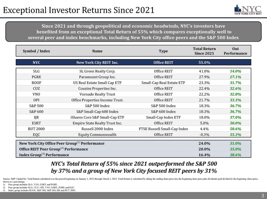 2 In 2021, NYC’s Board of Directors, led by Elizabeth Tuppeny, and in conjunction with the Advisor, continued to execute on the Co mpany’s strategic initiatives and operational momentum by mitigating adverse impacts from COVID - 19 by focusing on proactive asset manage ment, increasing Cash Rent (1) collection and completing new and renewal leases. As a result, NYC shareholders have benefited from a 55% Total Return (2)(3) since 2021 and as of December 31, 2021, NYC’s Advisor estimates that NYC’s NAV per share ranged from $21.94 - $27.92 (4) 2021 – Year in Review 2 2021 Highlights ▪ In Q1’21, Knotel, a former top 10 tenant, filed for bankruptcy and terminated all of their leased space with NYC (4) x Since termination, NYC executed new and expansion leases that replaced 69% of the square feet and 64% of the straight - line rent formerly from Knotel (4) ▪ In Q4’21, NYC executed a termination agreement with Icon Parking and Quik Park, two non - compliant tenants, and immediately backfilled the space with a new operator, City Parking x In November, the new operator began paying the new rent due under the license agreement ▪ In 2021, NYC completed 17 new leases totaling over 200,000 square feet and $7.4 million of straight - line rent x NYC also executed four lease renewals in 2021, including a five - year lease extension in Q4’21 with an Aa2 credit rated tenant that increased the Annualized Straight - line Rent (2) from the tenant by $0.3 million ▪ Q1’22 forward Leasing Pipeline of 14,300 SF that includes two new leases and two renewal and expansion leases x The Leasing Pipeline is expected to increase portfolio Occupancy from 83% to 84%, once pipeline leases commence ▪ NYC outperformed the S&P 500 by 37% and a group of New York City focused REIT peers by 31% (3) x NYC 2021 Total Return of 55% x New York City focused REIT peer performance of 24% ▪ NYC’s estimate of 2022 property - level income results in an estimated NAV per share of $21.94 - $27.92, indicating further significant upside potential for NYC shareholders (4) x 2022 estimated NAV per share represents a $10 - $16 per share premium on the March 1, 2022 closing price Proactive Asset and Property Management Successful Navigation Throughout COVID - 19 Impactful Leasing Activity Strong Shareholder Returns (3)(5) ▪ Since Q4’20 and through Q4’21, NYC increased its Cash Rent collection rate by 14% to 96% (1) x Q4’21 portfolio Cash Rent collection of 96% x 98% of Cash Rent collected from NYC’s top 10 tenants in Q4’21 ▪ Diligently and proactively communicated with tenants to help them navigate the COVID - 19 pandemic and mitigate adverse economic impacts x NYC collected 100% of the deferred rent due in Q3’21 and Q4’21 pursuant to an Approved Agreement (1) 1) Refer to slide 18 - Continued Cash Rent Collection Success for additional information. 2) See appendix for a full description of capitalized terms. 3) Refer to slide 3 - Exceptional Investor Returns in 2021 for additional information. 4) Refer to slide 16 - Case Study: Knotel Proactive Management 5) Refer to slide 4 - 2022 Estimated NAV per Share for additional information and slides 30 and 31 of the Appendix for additional i nformation relating to limitations on, and risks related to, the estimated NAV per share. NYC’s independent board members and the Advisor and its affiliates have each separately demonstrated its depth of commitment to NYC’s long - term value by increasing ownership in NYC. As of March 1st 2022, NYC’s independent board members owned over 57,000 shares of NYC and separately, NYC’s Advisor and its affiliates owned over 1,000,000 shares of NY C