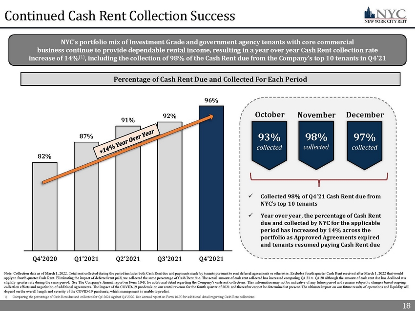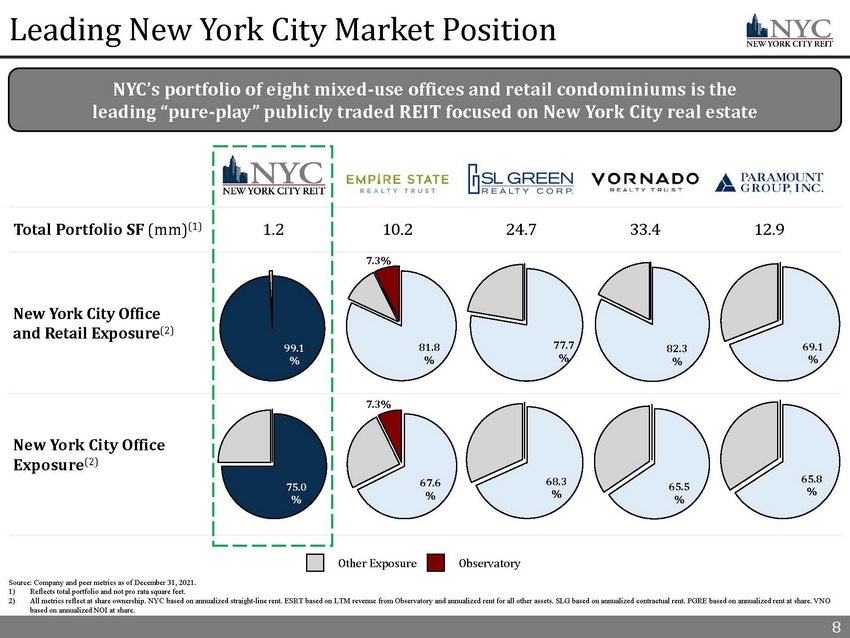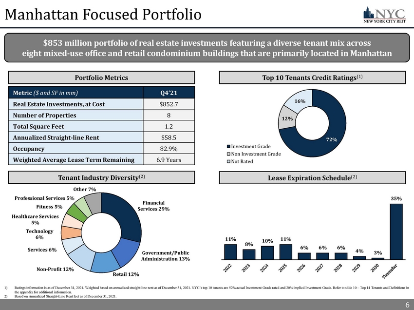 1 Fourth Quarter 2021 Highlights 1) See appendix for a full description of capitalized terms and Non - GAAP reconciliations. 2) Refer to slide 13 – Top 10 Tenant Investment Grade Profile. 3) Refer to slide 20 – Capital Structure and Q4’21 Financial Results for further information regarding our capital structure and liquidity. 4) Refer to slide 31 – Forward Looking Statements for risks related to our financial performance. 5) Refer to slide 18 – Q4’21 Cash Rent Collection for additional information. Total rent collected during the period includes both original Cash Rent due and payments made by tenants pursuant to rent deferral agreements. 6) For Q4’21, includes income from the accelerated amortization of the remaining unamortized balance of below - market lease liabilit ies of approximately $7.7 million and a termination fee of $1.4 million, which are both recorded in Revenue from tenants in t he consolidated statements of operations. Refer to slides 26 and 27 for additional information. 7) Refer to slide 14 – Proactive Asset Management and slide 15 - Case Study: Knotel Proactive Management for additional information . 8) Source: CBRE Pulse of U.S. Office Demand December 2021 report. 1 High - Quality Manhattan Focused Portfolio Increasing Financial Performance (3)(4) Continued Leasing Activity (7) Attractive Investment Opportunity x Portfolio Occupancy (1) of 83% with a weighted average Remaining Lease Term (1) of 6.9 years x NYC enhanced its tenant base in 2021 by adding credit - worthy rent - paying tenants, including a fortune 50 technology company and a publicly traded, Aa1 implied Investment Grade rated e - commerce technology company x Top 10 tenants (2) are 72% Investment Grade rated and have a Remaining Lease Term of 9.6 years x Well balance and long - term lease maturity schedule with 35% of leases expiring after 2030 x Year over year, total portfolio Cash Rent (1) collection improved from 82% to 96% (5) as Approved Agreements expired and tenants resumed paying original Cash Rent due x Quarter over quarter, Adjusted EBITDA (1)(6) and Cash NOI (1) improved to $11.9 million from $4.1 million and $7.1 million from $5.7 million, respectively x Weighted average debt maturity of 5.1 years and moderate Net Leverage (1) of 40% x NYC investors have benefited from an exceptional Total Return (1) of 55% since 2021 and through geopolitical and economic headwinds, as compared to several peer and index benchmarks including a New York City office peers and S&P 500 benchmark x In 2021, NYC executed 17 new leases and four lease renewals, totaling 200,000 square feet and $7.4 million of straight - line rent (7) □ NYC’s Leasing Pipeline (1) is expected to increase Occupancy by 1% and straight - line rent by $0.8 million x Since Knotel’s lease termination in January 2021, NYC replaced 69% of the total space and 64% of the straight - line rent formerly derived from Knotel with creditworthy, rent - paying tenants (7) □ NYC’s 2022 forward Leasing Pipeline is expected to replace an additional 14 ,000 square feet of former Knotel space x The rollback of COVID - 19 mandates in New York City coupled with 97% of adults being fully or partially vaccinated continues to support a return to pre - pandemic lifestyles and business activity □ Leasing activity, according to CBRE research, is at the pre - pandemic baseline (2018/2019 average), and ranks 6 th among the U.S. average, exemplifying strong business commitment to New York City’s office space and its human capital (8) x Management believes that there is significant upside for NYC as New York City continues to rebound and management leases available space to creditworthy tenants and evaluates strategic investment opportunities NYC is a real estate investment trust with a high - quality portfolio of real estate assets focused on the Manhattan market and is supported by a robust Advisor platform that has increased portfolio Cash Rent collection by 14% year over year, maintained an attractive top 10 tenant base that is 72% Investment Grade (1) rated and completed 17 new leases for over 200,000 SF in 2021