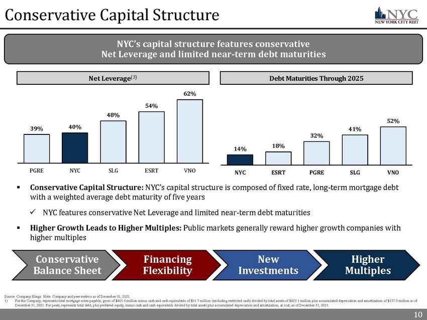 9 Well - Positioned Portfolio Compared to Peers 9 Sources: Company filings; U.S. Bureau of Labor Statistics as of December 31, 2021. Note: Company and peer metrics as of Decem ber 31, 2021 unless otherwise indicated. 1) Based on annualized straight - line rent as of December 31, 2021. NYC’s top 10 tenants were 52% actual Investment Grade rated and 20% implied Investment Grade rated tenants. Peer tenant percentages are only comprised of actual Investment Grade ratings. 2) For Company and Peers, based on annualized straight - line rent as of December 31, 2021. 3) In February 2022, the U.S. Bureau of Labor Statistics reported that Government and Financial Activities had the two lowest un emp loyment rates of 1.9% and 2.2% respectively, compared to total unemployment of 4.4%. Unemployment rates based on unemployed per sons by industry, not seasonally adjusted. Industry concentration for NYC based on SLR. ESRT, PGRE and VNO based on annualized rent. SLG based on contractual cash rent. VNO reflects New York City assets only as of December 31, 2021. Tenants Operating in Industries with Stable Employment (3) Share of Top 10 Tenants Investment Grade (1) Lease Expirations After 2030 (2) Highlights 72% Investment Grade rated (1) top 10 tenant base that is complemented by a balance of tenants with attractive industry exposures and long - term leases 37% 35% 33% 27% 24% PGRE NYC VNO SLG ESRT x NYC’s top ten tenants are 72% actual or implied Investment Grade rated and feature leases to large corporate tenants and government agencies x 35% of leases expire after 2030, limiting the impact of near - term lease expirations x Strong underlying tenant base with 42% of NYC’s tenants operating in industries with the lowest unemployment rates 13% 3% 2% 2% 29% 41% 37% 26% 17% 42% 41% 40% 28% 19% NYC PGRE SLG VNO ESRT Government Financial Activities 80% 72% 61% 55% 41% SLG NYC ESRT VNO PGRE
