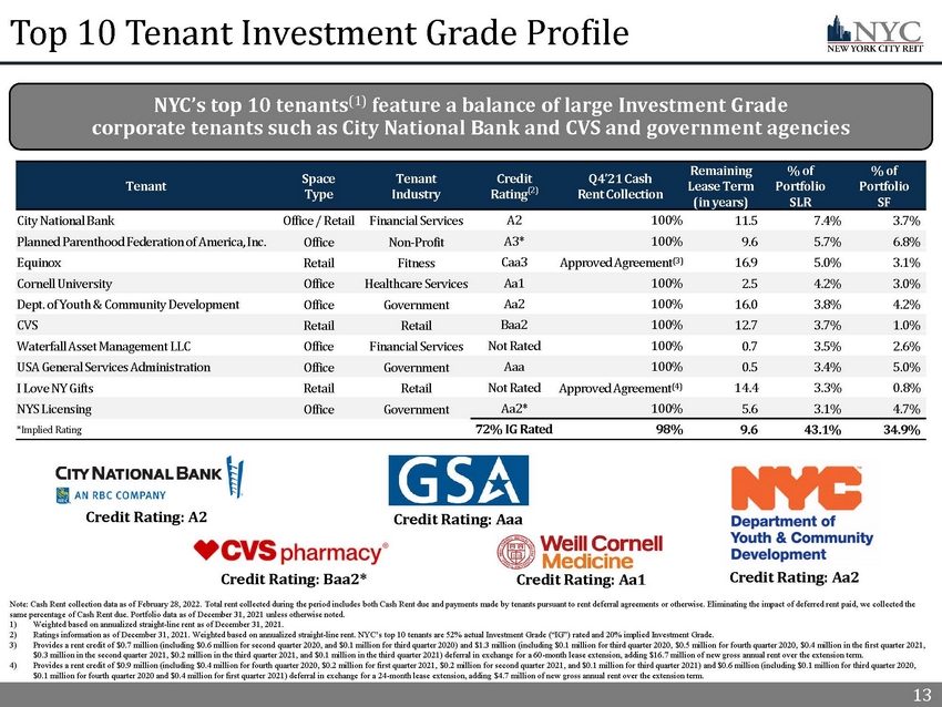 12 12 Detailed Property Summary Note: Data as of December 31, 2021. Portfolio Real Estate Assets, at cost ($ mm) Occupancy Remaining Lease Term (in years) % of Annualized Straight - Line Rent % of Portfolio Square Feet 123 William Street $288.9 91% 6.3 39% 47% _ 9 Times Square $185.9 61% 7.3 13% 14% _ 1140 Avenue of the Americas $175.0 74% 6.6 27% 21% _ 196 Orchard Street $89.4 100% 13.1 12% 5% _ 400 E. 67th Street $73.6 100% 2.5 7% 5% _ 200 Riverside Blvd. - ICON $19.3 100% 0.3 1% 5% _ 8713 Fifth Avenue $15.6 69% 2.0 1% 2% _ 421 W. 54th Street – Hit Factory $5.0 0% 0.0 0% 1% _ Total Portfolio $852.7 83% 6.9 100% 100% _ Note: Map shows seven properties located in Manhattan. Medical office building in Brooklyn not pictured. $853 million portfolio that is diversified across eight mixed - use office and retail condominium buildings that are primarily located in Manhattan