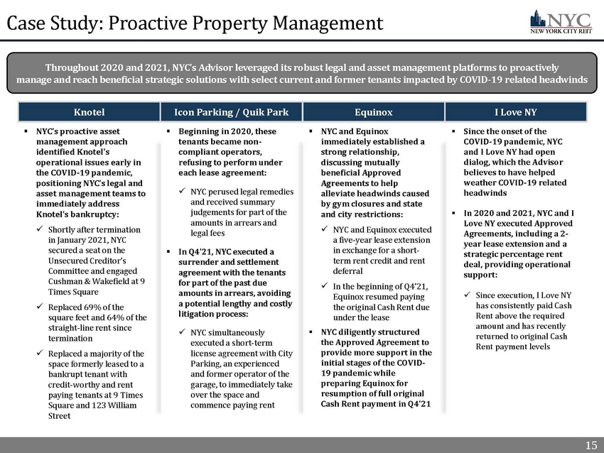 14 14 33% 45% 58% 69% In 2021, NYC’s Advisor completed 17 new leases that totaled over 200,000 square feet and $7.4 million of straight - line rent (1) and four lease renewals with high - quality rent - paying tenants. NYC’s Advisor also developed a 14,300 square foot forward Leasing Pipeline (2) that is expected to increase Occupancy from 83% to 84% Proactive Asset Management New Lease Replacement (3) (Portfolio | Building) Building 123 William Street Credit Rating Aaa Bankrupt Square Feet 15,136 21% | 42% Annual SLR ($ in 000) $787.1 21% | 40% Remaining Lease Term (4) 5 Years N/A 14 Knotel Replacement Lease With Fortune 50 Company Proactive Replacement of Space Terminated by Knotel (3) 2021 Leasing Highlights x NYC swiftly and proactively navigated the New York City market by executing new and renewal leases with credit - worthy and rent - paying tenants on attractive terms ▪ NYC executed four lease renewals in 2021, including a five - year lease extension in Q4’21 with an Aa2 credit rated tenant that increased the straight - line rent from the tenant by $0.3 million ▪ NYC actively marketed turn - key space formerly occupied by Knotel, replacing 69% the former tenant’s space since January 2021 with credit - worthy rent - paying tenants x Management expects to benefit in 2022 from the leasing momentum NYC generated in 2021 as new leases commence and the New York City market continues to rebound as COVID - 19 mandates are rolled back Replacement and Expansion For Former Knotel Space 1) As of lease execution date. 2) Amounts included in 2022 estimated property - level revenue, expenses and income. Refer to slide 5 for additional information and slides 29 and 30 of the Appendix for additional information relating to the limitations on, and risks related to, the estimat ed NAV per share and important disclosure notes. 3) As of December 31, 2020, Knotel occupied 71 ,207 square feet, totaled $3.9 million of Annualized Straight - line Rent and had 7.8 years of Remaining Lease Term. 4) See Appendix for a full description of capitalized terms. Knotel Termination Replacement Leases 0 SF shown in 000’s Increase From Expansion Replacement (3) (Portfolio | Building) Building 123 William Street Credit Rating Not Rated Bankrupt Square Feet 4,635 6% | 12% Annual SLR ($ in 000) $210.0 5% | 11% Remaining Lease Term (4) 5 Years N/A