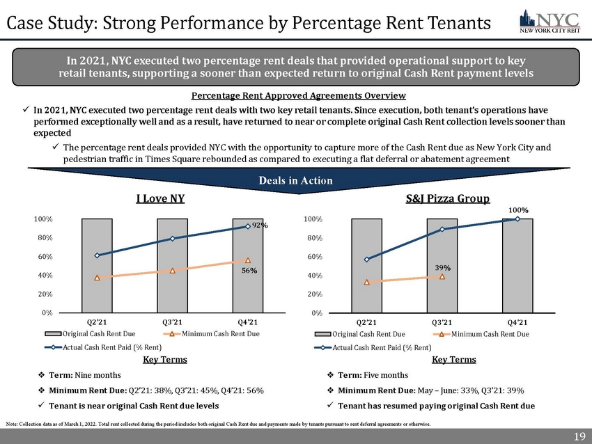 18 Continued Cash Rent Collection Success 18 Percentage of Cash Rent Due and Collected For Each Period Note: Collection data as of March 1, 2022. Total rent collected during the period includes both Cash Rent due and payments ma de by tenants pursuant to rent deferral agreements or otherwise. Excludes fourth quarter Cash Rent received after March 1, 2022 tha t would apply to fourth quarter Cash Rent. Eliminating the impact of deferred rent paid, we collected the same percentage of Cash Ren t d ue. The actual amount of cash rent collected has increased comparing Q4 21 v. Q4 20 although the amount of cash rent due has dec lined at a slightly greater rate during the same period. See The Company's Annual report on Form 10 - K for additional detail regarding the Company's cash rent collections. This information may not be indicative of any future period and remains subject to changes b as ed ongoing collection efforts and negotiation of additional agreements. The impact of the COVID - 19 pandemic on our rental revenue for the f ourth quarter of 2021 and thereafter cannot be determined at present. The ultimate impact on our future results of operations an d liquidity will depend on the overall length and severity of the COVID - 19 pandemic, which management is unable to predict. 1) Comparing the percentage of Cash Rent due and collected for Q4’2021 against Q4’2020. See Annual report on Form 10 - K for addition al detail regarding Cash Rent collections. 96% 92% 91% 87% 82% Q4'2021 Q3'2021 Q2'2021 Q1'2021 Q4'2020 93% collected 98% collected 97% collected October November December x Collected 98 % of Q4’21 Cash Rent due from NYC’s top 10 tenants x Year over year, the percentage of Cash Rent due and collected by NYC for the applicable period has increased by 14% across the portfolio as Approved Agreements expired and tenants resumed paying Cash Rent due NYC’s portfolio mix of Investment Grade and government agency tenants with core commercial business continue to provide dependable rental income, resulting in a y ear over year Cash Rent collection rate increase of 14% (1) , including the collection of 98% of the Cash Rent due from the Company’s top 10 tenants in Q4’21