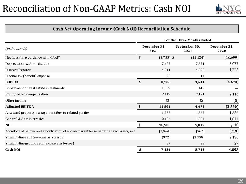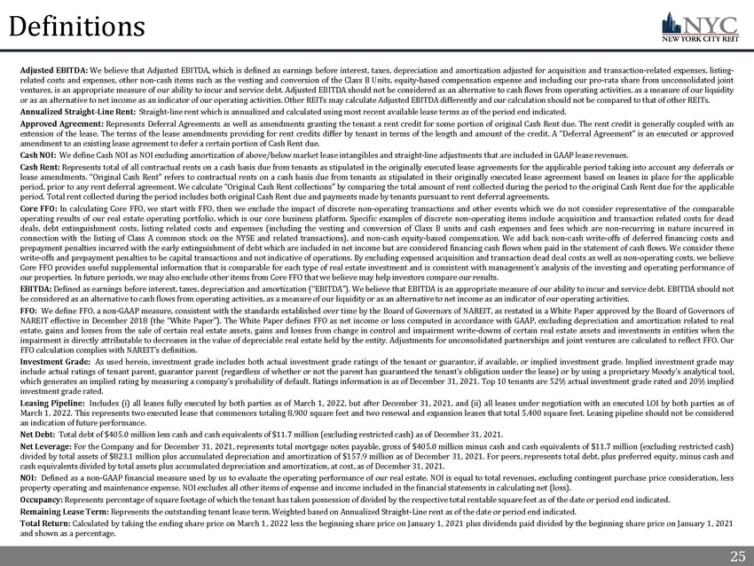 20 20 Capital Structure and Q4’21 Financial Results Note: As of December 31, 2021, we had cash and cash equivalents of $11.7 million (excluding restricted cash). We are, however , r equired to maintain a minimum net worth in excess of $175.0 million and minimum liquid assets of $10.0 million under our loan se cured by our 9 Times Square property, which limits our use of this cash. Our principal sources of cash in recent periods have been cash on hand, cash fro m p rior borrowings and cash from equity issuances under the Company’s at - the - market program. In some recent periods, including 2020 and 2021 to date, the net cash provided by our property operations has not been sufficient to fund operating expenses and other capital requirements. We ant ici pate we will continue to fund a portion of our operating expenses and capital expenditures from the proceeds of share issuan ces under the at - the - market program and the proceeds from property dispositions, if any. We may only incur additional indebtedness on our properties (except our only un encumbered property, the Hit Factory, which is unoccupied and therefore unlikely to be accepted as collateral for a new mortg age loan) with the consent of the existing lenders, which may not be granted on acceptable or favorable terms, or at all, if we were to seek to obtain it. 1) Subsequent to quarter end, NYC made a principle payment of $5.5 million pursuant to a waiver and amendment agreement with Cap ita l One with respect to the Company’s 9 Times Square property. 2) Includes income from the accelerated amortization of the remaining unamortized balance of below - market lease liabilities of appr oximately $7.7 million and a termination fee of $1.4 million, both are recorded in Revenue from tenants in the consolidated s tat ements of operations. Refer to slides 26 and 27 for additional information. 3) See Definitions in the appendix for a full description. 4) See appendix for Non - GAAP reconciliations. Limited debt maturities though 2025 and Net Leverage of 40% coupled with supportive tailwinds as the New York City market rebounds from the COVID - 19 pandemic to continue to support improved financial performance Capital Structure x Fixed rate, long - term mortgage debt with a weighted averaged effective interest rate 4.4% x Weighted average debt maturity of 5.1 years with no debt maturities through 2023 and Net Leverage of 40.1% x Since listing in August 2020, NYC has accessed equity capital markets and continues to position the Company for attractive acquisition opportunities Key Financial Results ($ mm) Q4’20 Q4’21 (2) Revenue from Tenants $9.9 $24.2 Net Loss ($16.6) ($3.8) Funds from Operations (3)(4) ($8.9) $4.9 Core Funds from Operations (3)(4) ($6.8) $7.1 Cash NOI (2)(3) $4.1 $7.1 Key Capitalization Metrics ($ and shares in mm) Q4’21 Fixed / Floating Debt % 100% / 0% Weighted Averaged Effective Interest Rate 4.4% Total Debt $405.0 Net Debt (1) $393.3 Real estate assets, at cost $852.7 Net Leverage 40.1% Basic and Diluted Shares Outstanding 13.3 Debt Maturity Schedule $55.0 (1) $99.0 $140.0 $60.0 $51.0 $40.0 $60.0 $80.0 $100.0 $120.0 $140.0 $160.0 $180.0 2022 2023 2024 2025 2026 2027 2028 2029 2030+