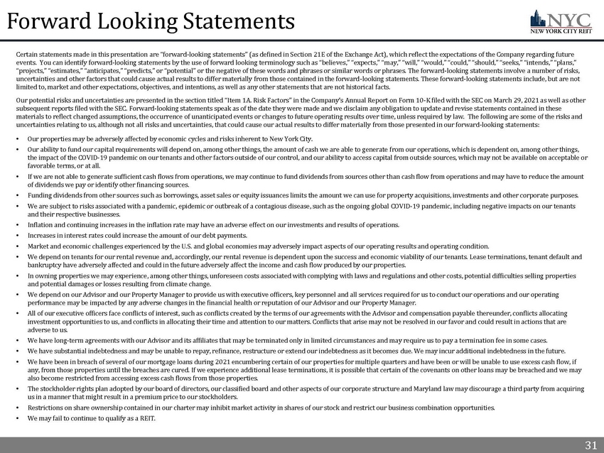 30 30 Limitations on, and risks related to, the Estimated NAV per Share The Company’s estimated net asset value per share (“NAV”) as of December 31, 2021 contained herein was calculated by applying tw o different capitalization rates to property - level income projected for 2022 by the advisor to arrive at the estimated market value of the Company’s portfolio, and then deducting from this amou nt the fair value of the Company’s mortgage notes payable as of December 31, 2021 as set forth in the notes to the Company’s financial statements as of December 31 , 2021, and adding the book value of cash and cash equivalents and other assets, net of other liabilities, as set forth in the Company’s financial statements as of December 31, 2021. The estimated NAV per share was calc ula ted by dividing the estimated NAV by the number of shares of the Company’s Class A common stock on a fully - diluted basis outstanding as of December 31, 2021. The estimated NAV per share was calculated as of a specific time, will likely change, and does not represent the amount a sto ckh older would receive from a third party now or in the future for his or her shares of the Company’s Class A common stock. There is no assurance that the trading price of the Company’s Class A commo n s tock will not continue to trade at a significant discount to, equal or exceed this estimate. The estimated NAV per share does not represent the book value of the Company’s real estate, which is ge ner ally based on the amortized cost of the property, subject to certain adjustments, or the Company’s enterprise value. The estimated NAV per share is not a representation or guarantee that the Com pan y’s shares of Class A common stock will or should trade at this amount, and investors should not rely on the estimated NAV per share in making a decision to buy or sell shares of the Compan y’s Class A common stock. The measures employed by the Company’s advisor to project property - level income and calculate this estimate of NAV per share may not be comparable to measures used by other companies and were based upon a number of estimates, assumptions, judgments and opinions made by the Company’s advisor that may not be accu rat e or complete, including estimates and assumptions such as capitalization rates and estimations of new or extended leases, future rent and expenses. The advisor’s estimation of propert y - l evel income does not include any acquisitions or dispositions in calendar year 2022 except for the sale of the Hit Factory. Acquisitions or dispositions would impact actual property - level incom e and the estimated NAV per share depending on how the Company funded the acquisitions which could include the net proceeds from issuance of additional shares of Class A common stock. The Hit Factory property, as previously disclosed, is not generating income. The estimated market value of the Company’s real estate assets is based solely on the advisor’s estimation of property - level inc ome for 2022, applying capitalization rates selected by the advisor based on its opinion and knowledge of the New York City real estate marke t , without any independent third - party review or third - party appraisals of assets and does not necessarily represent the value th e Company would receive or accept if the Company’s real estate assets were marketed for sale or a third - party appraisal of the Com pany’s real estate assets or the price the Company's board may accept if a third party made an offer for the shares of the Class A common stock. The estimated value also does not take into consid era tion transaction costs or other items such as tax adjustments that may impact the value a buyer might ascribe to the Company’s real estate assets. Estimation of Property - Level Income In connection with estimating NAV, the Company’s advisor prepared an unaudited estimation of the Company’s property - level income for all of calendar year 2022. This information is subjective in many respects and is not necessarily predicative of actual future results and should not be relied upon as such. The internal pr ospective financial information used by the Company’s advisor to prepare the property - level income estimation for 2022 was based on numerous variables and assumptions that were deemed to be rea sonable as of date when the estimation was finalized. These assumptions are inherently uncertain and may be beyond the Company’s control. Important factors that may affect actual result s a nd cause the Company to fail to meet the estimation include, but are not limited to, risks and uncertainties relating to the Company’s business (including that tenant pay the cash rent required in their respective leases and the Company does not incur significant additional expenses that are not anticipated), the potential adverse effects of the ongoing global COVID - 19 pandemic, including actions taken to contain or treat COVID - 19, on the Company’s tenants and the global economy and financial market, industry performance, including volatility in the financial markets resulting fr om the ongoing war in Ukraine, the legal and regulatory environment, general business and economic conditions and other factors described or referenced under the section entitled “Forward - Looking S tatements” contained in the Appendix to this presentation, including those presented in the section titled “Item 1A. Risk Factors” in the Company’s Annual Report on Form 10 - K filed with t he SEC on March 29, 2021 and all other filings filed with the SEC after that date. There can be no assurance that the estimation will be realized or that actual results will not be significantly hi ghe r or lower than forecasted. In addition, the estimation was not prepared with a view toward complying with U.S. generally accepted accounting principles, th e published guidelines of the SEC regarding estimations and the use of non - GAAP measures or the 