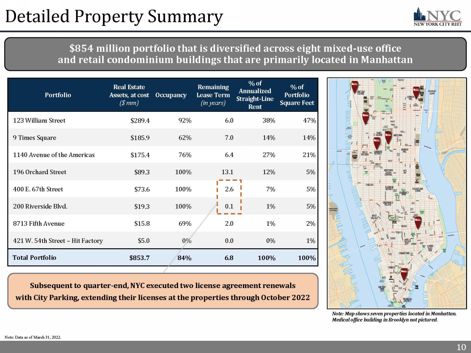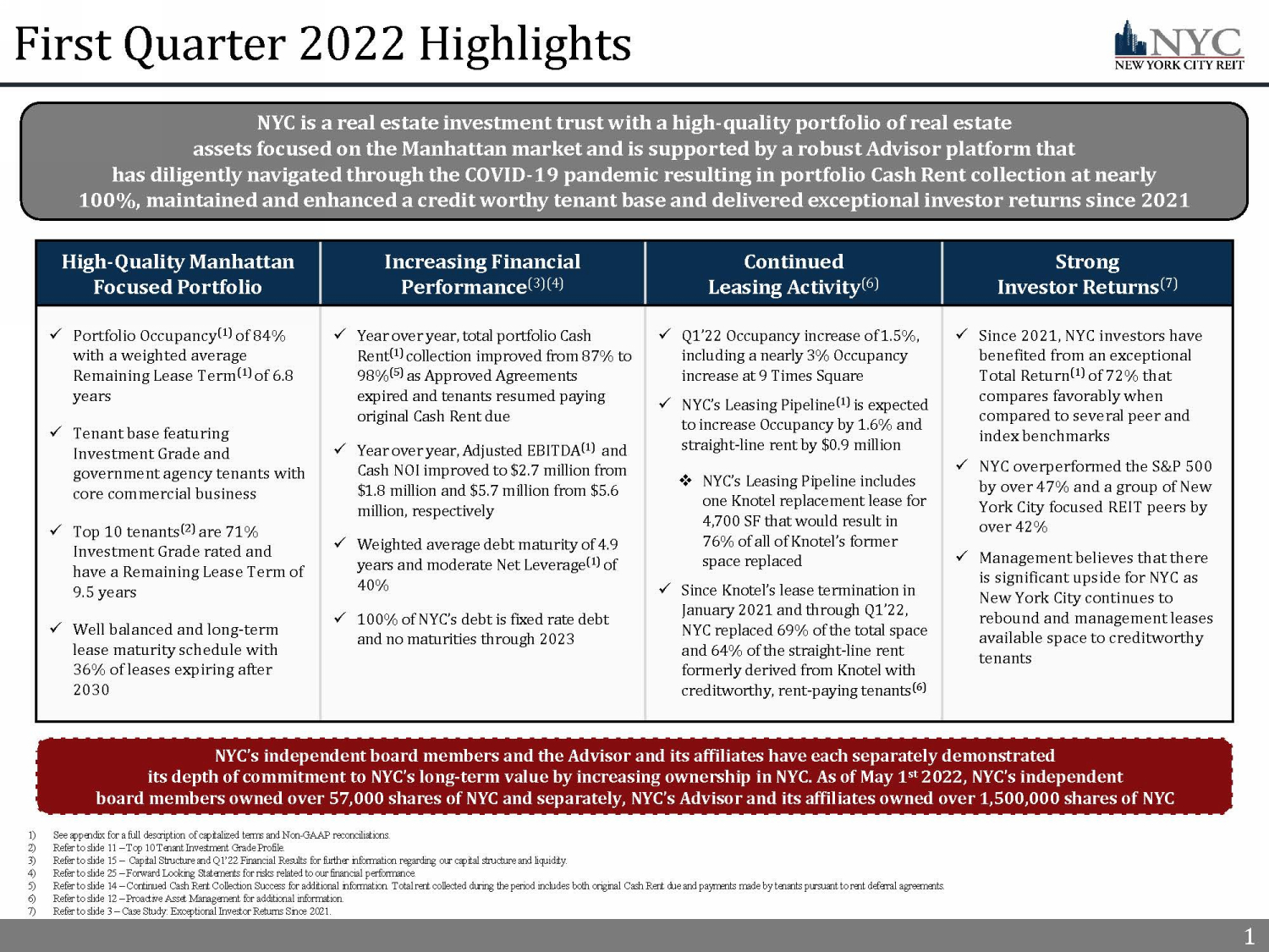 1 First Quarter 2022 Highlights 1) See appendix for a full description of capitalized terms and Non - GAAP reconciliations. 2) Refer to slide 11 – Top 10 Tenant Investment Grade Profile. 3) Refer to slide 15 – Capital Structure and Q1’22 Financial Results for further information regarding our capital structure and liquidity. 4) Refer to slide 25 – Forward Looking Statements for risks related to our financial performance. 5) Refer to slide 14 – Continued Cash Rent Collection Success for additional information. Total rent collected during the period in cludes both original Cash Rent due and payments made by tenants pursuant to rent deferral agreements. 6) Refer to slide 12 – Proactive Asset Management for additional information. 7) Refer to slide 3 – Case Study: Exceptional Investor Returns Since 2021. 1 High - Quality Manhattan Focused Portfolio Increasing Financial Performance (3)(4) Continued Leasing Activity (6) Strong Investor Returns (7) x Portfolio Occupancy (1) of 84% with a weighted average Remaining Lease Term (1) of 6.8 years x Tenant base featuring Investment Grade and government agency tenants with core commercial business x Top 10 tenants (2) are 71% Investment Grade rated and have a Remaining Lease Term of 9.5 years x Well balanced and long - term lease maturity schedule with 36% of leases expiring after 2030 x Year over year, total portfolio Cash Rent (1) collection improved from 87% to 98% (5) as Approved Agreements expired and tenants resumed paying original Cash Rent due x Year over year, Adjusted EBITDA (1) and Cash NOI improved to $2.7 million from $1.8 million and $5.7 million from $5.6 million, respectively x Weighted average debt maturity of 4.9 years and moderate Net Leverage (1) of 40% x 100% of NYC’s debt is fixed rate debt and no maturities through 2023 x Q1’22 Occupancy increase of 1.5%, including a nearly 3% Occupancy increase at 9 Times Square x NYC’s Leasing Pipeline (1) is expected to increase Occupancy by 1.6% and straight - line rent by $0.9 million □ NYC’s Leasing Pipeline includes one Knotel replacement lease for 4,700 SF that would result in 76% of all of Knotel’s former space replaced x Since Knotel’s lease termination in January 2021 and through Q1’22, NYC replaced 69% of the total space and 64% of the straight - line rent formerly derived from Knotel with creditworthy, rent - paying tenants (6) x Since 2021, NYC investors have benefited from an exceptional Total Return (1) of 72% that compares favorably when compared to several peer and index benchmarks x NYC overperformed the S&P 500 by over 47% and a group of New York City focused REIT peers by over 42% x Management believes that there is significant upside for NYC as New York City continues to rebound and management leases available space to creditworthy tenants NYC is a real estate investment trust with a high - quality portfolio of real estate assets focused on the Manhattan market and is supported by a robust Advisor platform that has diligently navigated through the COVID - 19 pandemic resulting in portfolio Cash Rent collection at nearly 100%, maintained and enhanced a credit worthy tenant base and delivered exceptional investor returns since 2021 NYC’s independent board members and the Advisor and its affiliates have each separately demonstrated its depth of commitment to NYC’s long - term value by increasing ownership in NYC. As of May 1 st 2022, NYC’s independent board members owned over 57,000 shares of NYC and separately, NYC’s Advisor and its affiliates owned over 1,500,000 shares of NY C