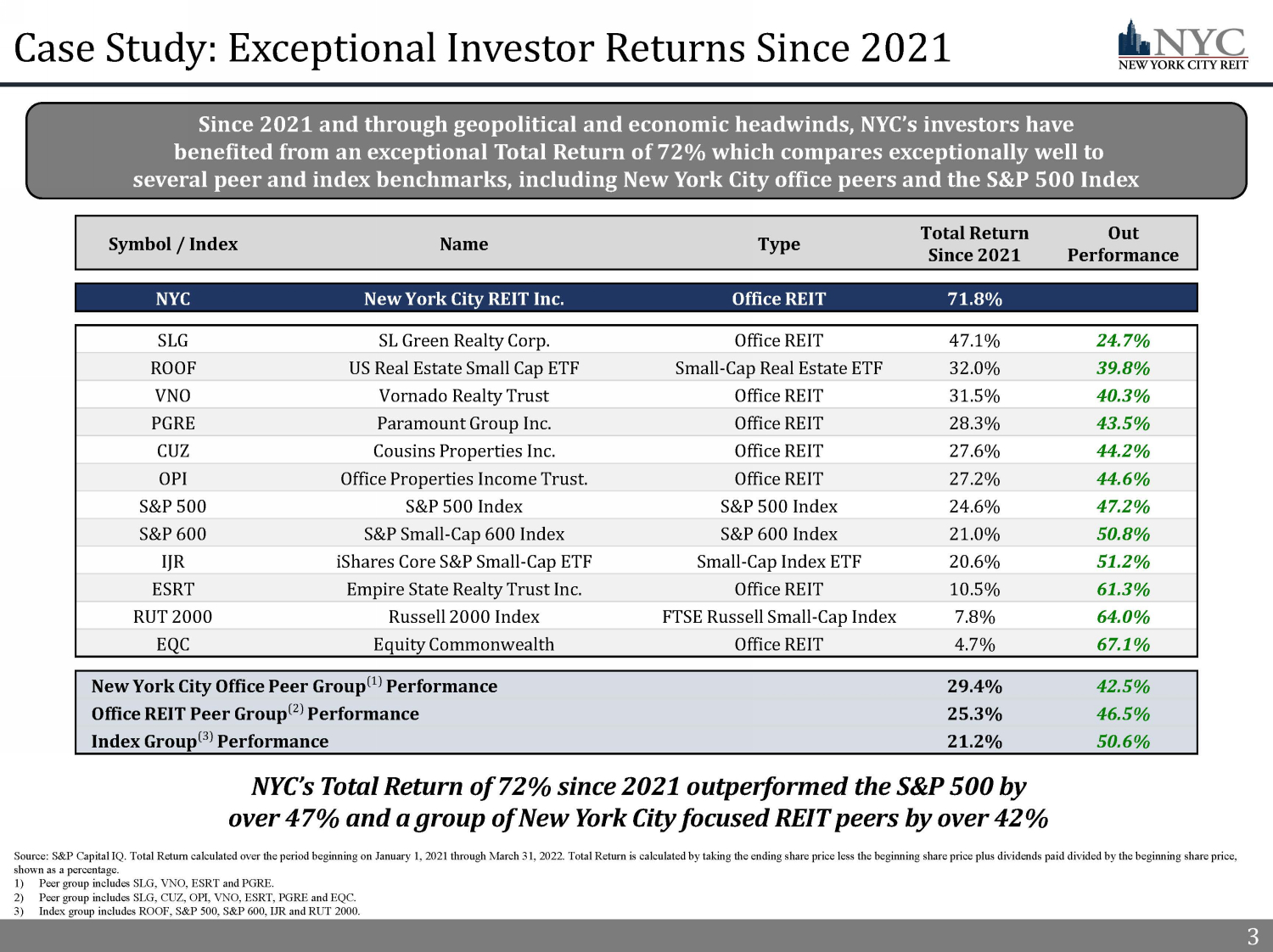 2 2 In 2021, NYC’s Board of Directors, led by Elizabeth Tuppeny, and in conjunction with the Advisor, continued to execute on the Company’s strategic initiatives and operational momentum by mitigating adverse impacts from COVID - 19 by focusing on proactive asset management, increasing Cash Rent (1) collection and completing new and renewal leases. As a result, NYC shareholders benefited from a 72% Total Return (2) since 2021 NYC Generated Significant Value For Shareholders in 2021 2 2021 Highlights ▪ In Q1’21, Knotel, a former top 10 tenant, filed for bankruptcy and terminated all of their leased space with NYC x Since termination, NYC executed new and expansion leases that replaced 69% of the square feet and 64% of the straight - line rent formerly from Knotel ▪ In Q4’21, NYC executed a termination agreement with Icon Parking and Quik Park, two non - compliant tenants, and immediately backfilled the space with a new operator, City Parking x In Q2’22, City Parking extended its license agreements and will continue its operations through October 2022 ▪ In 2021, NYC completed 17 new leases totaling over 200,000 square feet and $7.4 million of straight - line rent x NYC also executed four lease renewals in 2021, including a five - year lease extension in Q4’21 with an Aa2 credit rated tenant that increased the Annualized Straight - line Rent (3) from the tenant by $0.3 million as of December 31, 2021 ▪ Q2’22 forward Leasing Pipeline of 18,000 SF that includes three executed new leases and one executed LOI for former Knotel space x The Leasing Pipeline is expected to increase portfolio Occupancy from 84% to 86%, once pipeline leases commence ▪ NYC outperformed the S&P 500 by over 47% and a group of New York City focused REIT peers over 42% (2) x NYC 2021 Total Return of 72% x New York City focused REIT peer performance of 29% x Index Group Performance of 21% ▪ As of May 1st, 2022, NYC’s independent board members owned over 57,000 shares of NYC and separately, NYC’s Advisor and its affiliates owned over 1,500,000 shares of NYC, demonstrating their depth of commitment to NYC’s long - term value by increasing ownership in NYC Proactive Asset and Property Management Successful Navigation Throughout COVID - 19 Impactful Leasing Activity Strong Shareholder Returns (2) ▪ Since Q4’20 and through Q4’21, NYC increased its Cash Rent collection rate by 15% to 97% (1) x Q1’22 portfolio Cash Rent collection of 98% ▪ Diligently and proactively communicated with tenants to help them navigate the COVID - 19 pandemic and mitigate adverse economic impacts x In 2021, NYC executed two percentage rent deals with two key retail tenants. Since execution, both tenant’s operations have performed exceptionally well and returned to paying near full original Cash Rent due 1) Refer to slide 14 - Continued Cash Rent Collection Success for additional information. 2) Refer to slide 3 - Case Study: Exceptional Investor Returns Since 2021. 3) See appendix for a full description of capitalized terms.