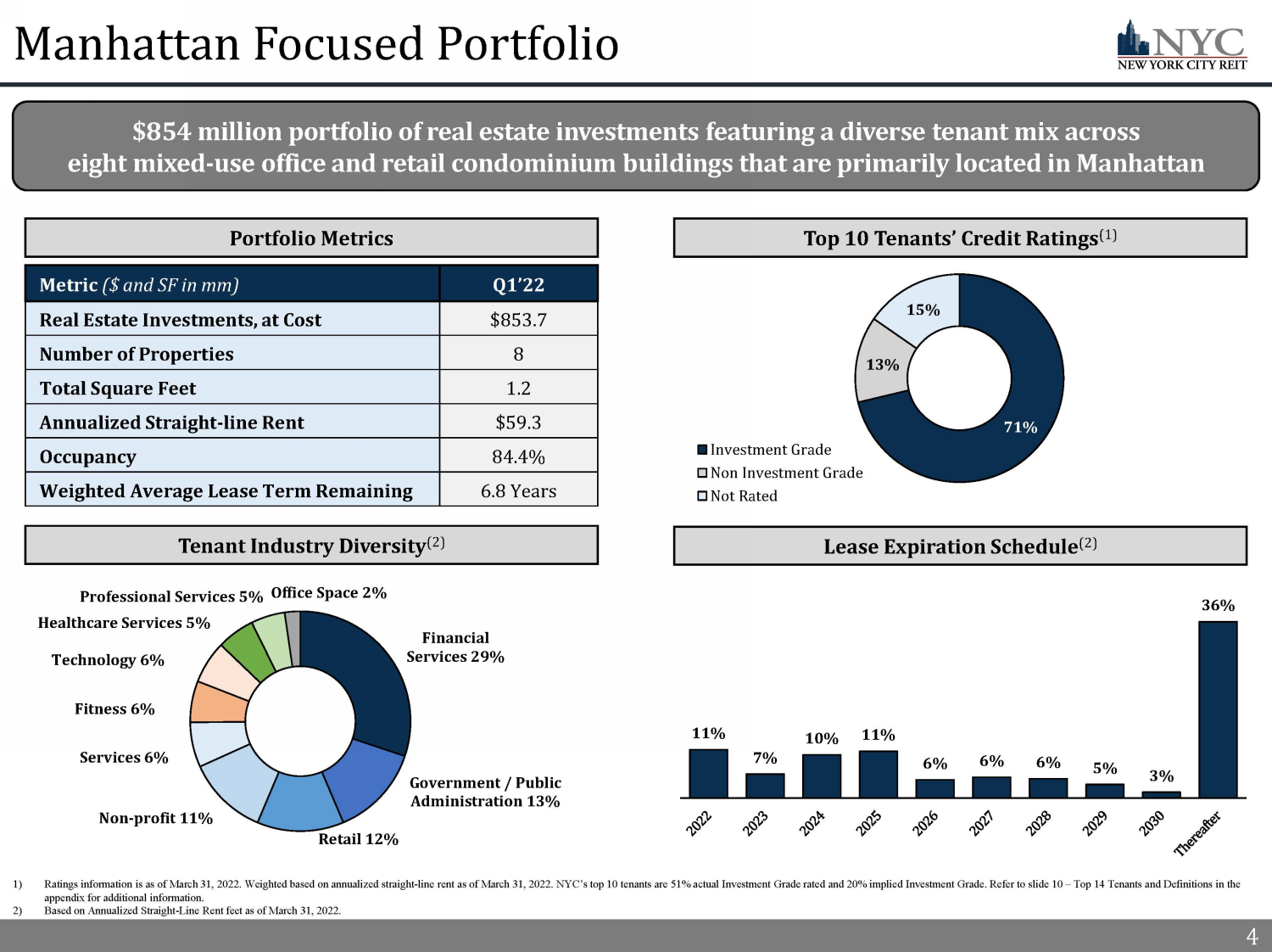 3 Case Study: Exceptional Investor Returns Since 2021 3 Since 2021 and through geopolitical and economic headwinds, NYC’s investors have benefited from an exceptional Total Return of 72% which compares exceptionally well to several peer and index benchmarks, including New York City office peers and the S&P 500 Index Symbol / Index Name Type Total Return Since 2021 Out Performance NYC New York City REIT Inc. Office REIT 71.8% SLG SL Green Realty Corp. Office REIT 47.1% 24.7% ROOF US Real Estate Small Cap ETF Small - Cap Real Estate ETF 32.0% 39.8% VNO Vornado Realty Trust Office REIT 31.5% 40.3% PGRE Paramount Group Inc. Office REIT 28.3% 43.5% CUZ Cousins Properties Inc. Office REIT 27.6% 44.2% OPI Office Properties Income Trust. Office REIT 27.2% 44.6% S&P 500 S&P 500 Index S&P 500 Index 24.6% 47.2% S&P 600 S&P Small - Cap 600 Index S&P 600 Index 21.0% 50.8% IJR iShares Core S&P Small - Cap ETF Small - Cap Index ETF 20.6% 51.2% ESRT Empire State Realty Trust Inc. Office REIT 10.5% 61.3% RUT 2000 Russell 2000 Index FTSE Russell Small - Cap Index 7.8% 64.0% EQC Equity Commonwealth Office REIT 4.7% 67.1% New York City Office Peer Group (1) Performance 29.4% 42.5% Office REIT Peer Group (2) Performance 25.3% 46.5% Index Group (3) Performance 21.2% 50.6% NYC’s Total Return of 72% since 2021 outperformed the S&P 500 by over 47% and a group of New York City focused REIT peers by over 42% Source: S&P Capital IQ. Total Return calculated over the period beginning on January 1, 2021 through March 31, 2022. Total Return is calculated by taking the ending share price less the beginning share price plus dividends paid divided by the beginning share price, shown as a percentage. 1) Peer group includes SLG, VNO, ESRT and PGRE. 2) Peer group includes SLG, CUZ, OPI, VNO, ESRT, PGRE and EQC. 3) Index group includes ROOF, S&P 500, S&P 600, IJR and RUT 2000.