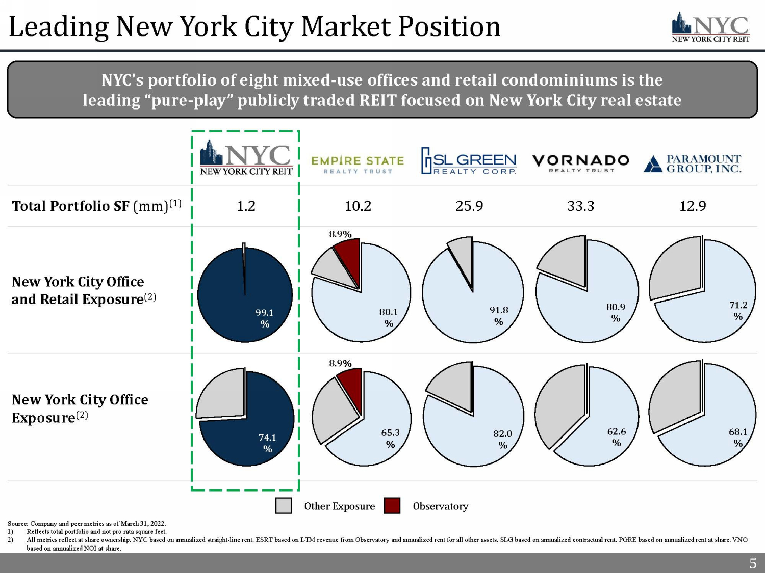 4 Manhattan Focused Portfolio Metric ($ and SF in mm) Q1’22 Real Estate Investments, at Cost $853.7 Number of Properties 8 Total Square Feet 1.2 Annualized Straight - line Rent $59.3 Occupancy 84.4% Weighted Average Lease Term Remaining 6.8 Years 1) Ratings information is as of March 31, 2022. Weighted based on annualized straight - line rent as of March 31, 2022. NYC’s top 10 tenants are 51% actual Investment Grade rated and 20% implied Investment Grade. Refer to slide 10 – Top 14 Tenants and Definitions in the appendix for additional information. 2) Based on Annualized Straight - Line Rent feet as of March 31 , 2022. 4 11% 7% 10% 11% 6% 6% 6% 5% 3% 36% Financial Services 29% Government / Public Administration 13% Retail 12% Non - profit 11% Services 6% Fitness 6% Technology 6% Healthcare Services 5% Professional Services 5% Office Space 2% $854 million portfolio of real estate investments featuring a diverse tenant mix across eight mixed - use office and retail condominium buildings that are primarily located in Manhattan Top 10 Tenants’ Credit Ratings (1) Tenant Industry Diversity (2) Lease Expiration Schedule (2) Portfolio Metrics 71% 13% 15% Investment Grade Non Investment Grade Not Rated