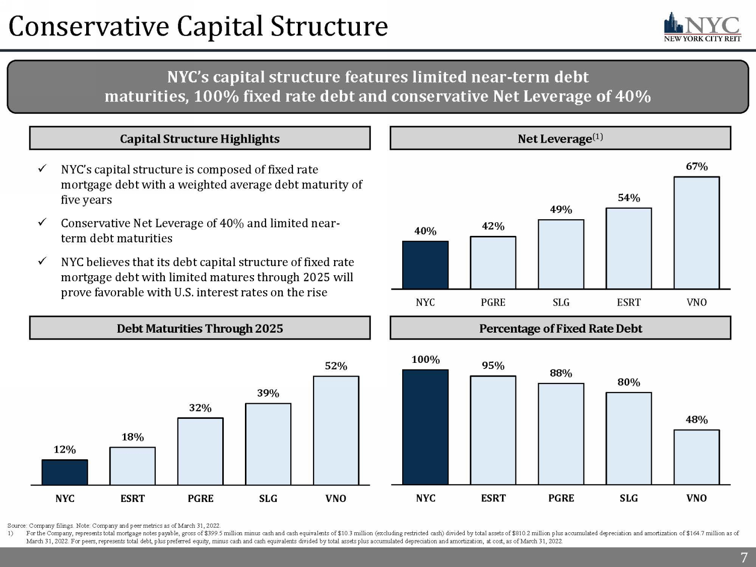 6 Well - Positioned Portfolio Compared to Peers 6 Sources: Company filings; U.S. Bureau of Labor Statistics as of March 31, 2022. Note: Company and peer metrics as of March 31 , 2 022 unless otherwise indicated. 1) Based on annualized straight - line rent as of March 31, 2022. NYC’s top 10 tenants were 51% actual Investment Grade rated and 20% implied Investment Grade rated tenants. Peer tenant percentages are only comprised of actual Investment Grade ratings. 2) For Company and Peers, based on annualized straight - line rent as of March 31, 2022. 3) In April 2022, the U.S. Bureau of Labor Statistics reported that Government and Financial Activities had the two lowest unemp loy ment rates of 1.5% and 1.9% respectively, compared to total unemployment of 3.3%. Unemployment rates based on unemployed per son s by industry, not seasonally adjusted. Industry concentration for NYC based on SLR. ESRT, PGRE and VNO based on annualized rent. SLG based on contractual cash rent. VNO reflects New York City assets only as of December 31, 2021. Tenants Operating in Industries with Stable Employment (3) Share of Top 10 Tenants Investment Grade (1) Lease Expirations After 2030 (2) Highlights 71% Investment Grade rated (1) top 10 tenant base that is complemented by a balance of tenants with attractive industry exposures and long - term leases 38% 36% 34% 28% 26% PGRE NYC VNO SLG ESRT x NYC’s top ten tenants are 71% actual or implied Investment Grade rated and feature leases to large corporate tenants and government agencies x 36% of leases expire after 2030, limiting the impact of near - term lease expirations x Strong underlying tenant base with 42% of NYC’s tenants operating in industries with the lowest unemployment rates 13% 3% 2% 2% 29% 40% 37% 28% 16% 42% 40% 40% 30% 18% NYC PGRE SLG VNO ESRT Government Financial Activities 80% 71% 61% 55% 41% SLG NYC ESRT VNO PGRE