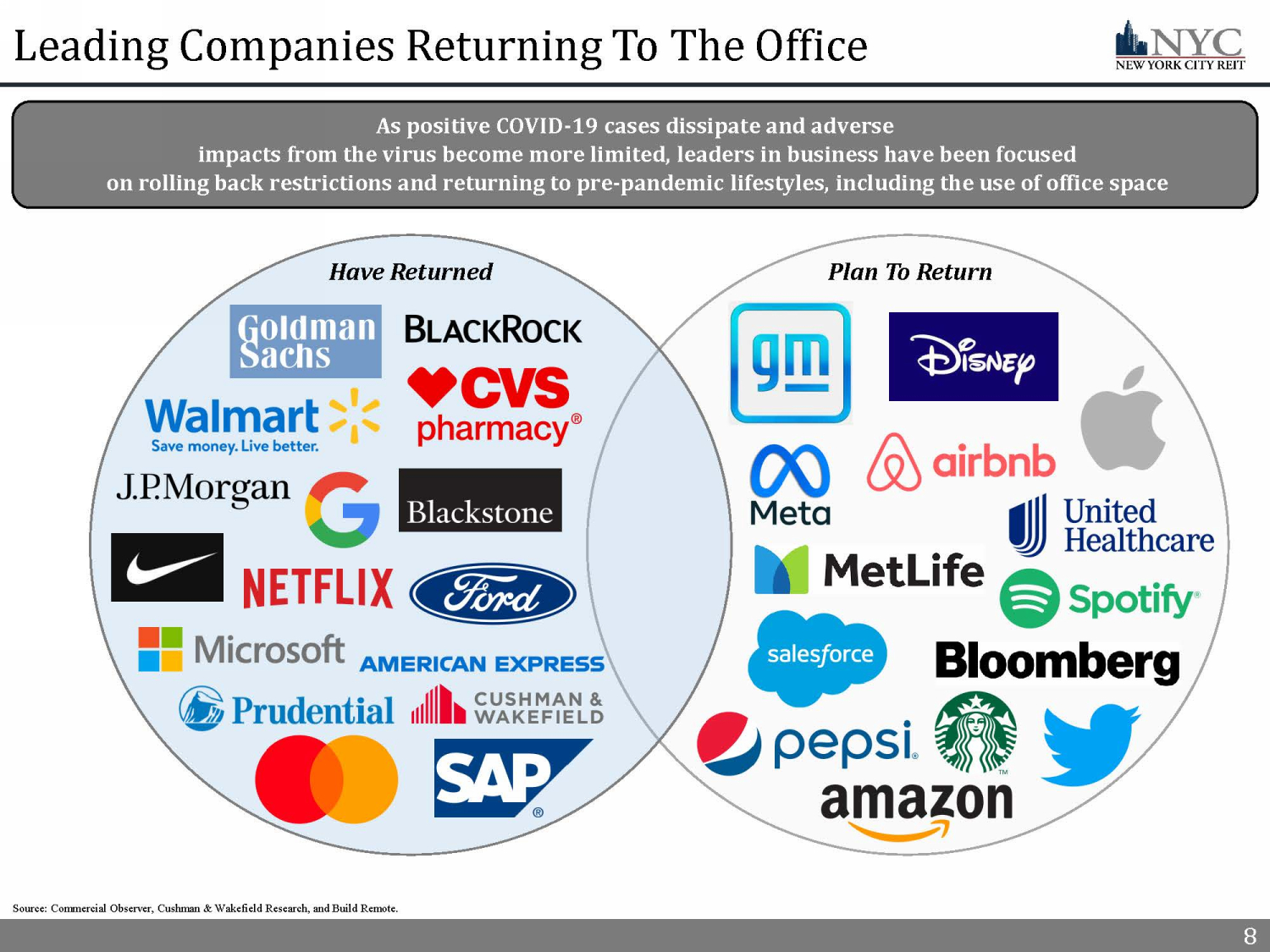 8 Leading Companies Returning To The Office 8 As positive COVID - 19 cases dissipate and adverse impacts from the virus become more limited, leaders in business have been focused on rolling back restrictions and returning to pre - pandemic lifestyles, including the use of office space Have Returned Plan To Return Source: Commercial Observer, Cushman & Wakefield Research, and Build Remote.