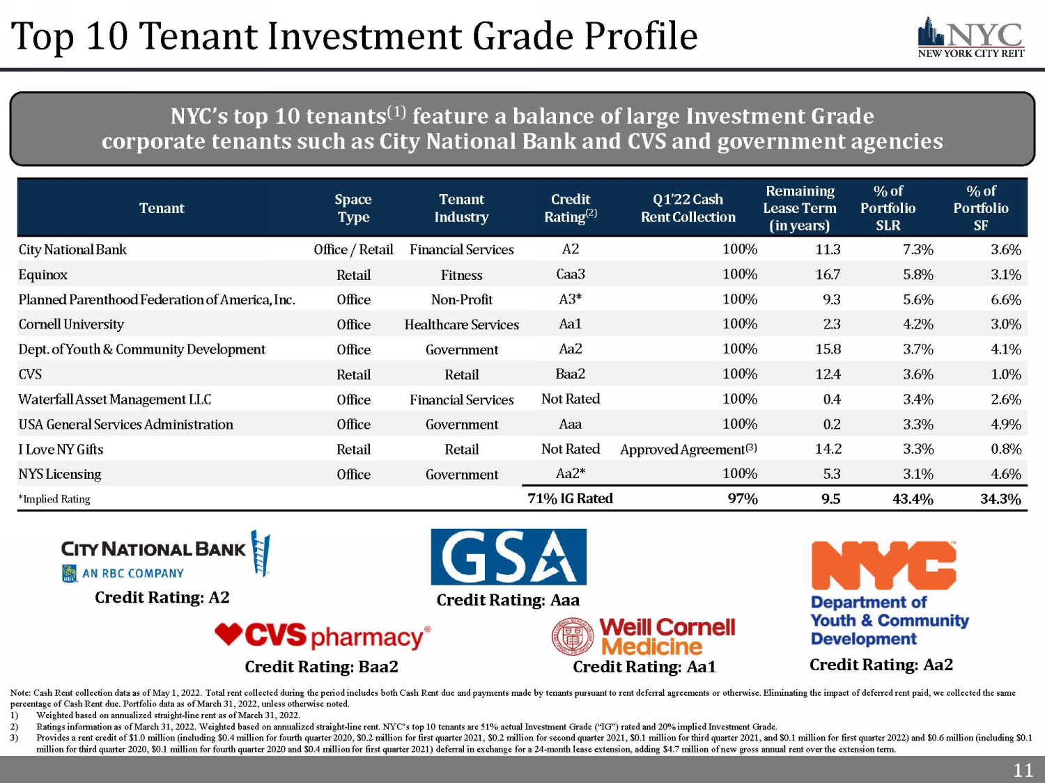 10 10 Detailed Property Summary Note: Data as of March 31, 2022. Portfolio Real Estate Assets, at cost ($ mm) Occupancy Remaining Lease Term (in years) % of Annualized Straight - Line Rent % of Portfolio Square Feet 123 William Street $289.4 92% 6.0 38% 47% _ 9 Times Square $185.9 62% 7.0 14% 14% _ 1140 Avenue of the Americas $175.4 76% 6.4 27% 21% _ 196 Orchard Street $89.3 100% 13.1 12% 5% _ 400 E. 67th Street $73.6 100% 2.6 7% 5% _ 200 Riverside Blvd. $19.3 100% 0.1 1% 5% _ 8713 Fifth Avenue $15.8 69% 2.0 1% 2% _ 421 W. 54th Street – Hit Factory $5.0 0% 0.0 0% 1% _ Total Portfolio $853.7 84% 6.8 100% 100% _ Note: Map shows seven properties located in Manhattan. Medical office building in Brooklyn not pictured. $854 million portfolio that is diversified across eight mixed - use office and retail condominium buildings that are primarily located in Manhattan Subsequent to quarter - end, NYC executed two license agreement renewals with City Parking, extending their licenses at the properties through October 2022