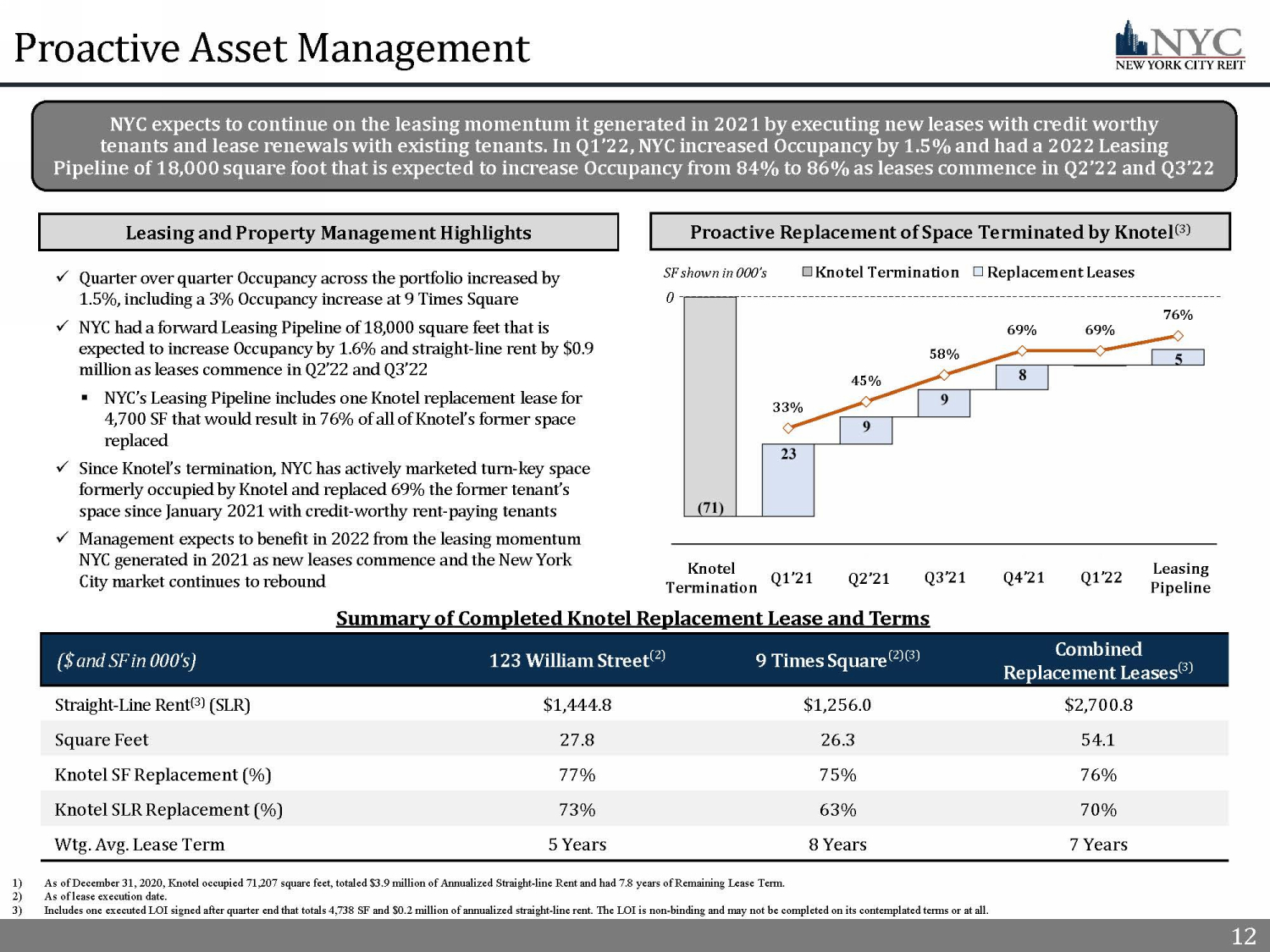11 11 Note: Cash Rent collection data as of May 1, 2022. Total rent collected during the period includes both Cash Rent due and pay men ts made by tenants pursuant to rent deferral agreements or otherwise. Eliminating the impact of deferred rent paid, we collec ted the same percentage of Cash Rent due. Portfolio data as of March 31, 2022, unless otherwise noted. 1) Weighted based on annualized straight - line rent as of March 31, 2022. 2) Ratings information as of March 31, 2022. Weighted based on annualized straight - line rent. NYC’s top 10 tenants are 51% actual I nvestment Grade (“IG”) rated and 20% implied Investment Grade. 3) Provides a rent credit of $1.0 million (including $0.4 million for fourth quarter 2020, $0.2 million for first quarter 2021, $0. 2 million for second quarter 2021, $0.1 million for third quarter 2021, and $0.1 million for first quarter 2022) and $0.6 mil lio n (including $0.1 million for third quarter 2020, $0.1 million for fourth quarter 2020 and $0.4 million for first quarter 2021) deferral in exc han ge for a 24 - month lease extension, adding $4.7 million of new gross annual rent over the extension term. Top 10 Tenant Investment Grade Profile Tenant Space Type Tenant Industry Credit Rating (2) Q1’22 Cash Rent Collection Remaining Lease Term (in years) % of Portfolio SLR % of Portfolio SF City National Bank Office / Retail Financial Services A2 100% 11.3 7.3% 3.6% _ Equinox Retail Fitness Caa3 100% 16.7 5.8% 3.1% _ Planned Parenthood Federation of America, Inc. Office Non - Profit A3* 100% 9.3 5.6% 6.6% _ Cornell University Office Healthcare Services Aa1 100% 2.3 4.2% 3.0% _ Dept. of Youth & Community Development Office Government Aa2 100% 15.8 3.7% 4.1% _ CVS Retail Retail Baa2 100% 12.4 3.6% 1.0% _ Waterfall Asset Management LLC Office Financial Services Not Rated 100% 0.4 3.4% 2.6% _ USA General Services Administration Office Government Aaa 100% 0.2 3.3% 4.9% _ I Love NY Gifts Retail Retail Not Rated Approved Agreement (3) 14.2 3.3% 0.8% _ NYS Licensing Office Government Aa2* 100% 5.3 3.1% 4.6% _ *Implied Rating 71% IG Rated 97% 9.5 43.4% 34.3% _ Credit Rating: A2 Credit Rating: Aa1 Credit Rating: Baa2 Credit Rating: Aaa Credit Rating: Aa2 NYC’s top 10 tenants (1) feature a balance of large Investment Grade corporate tenants such as City National Bank and CVS and government agencies