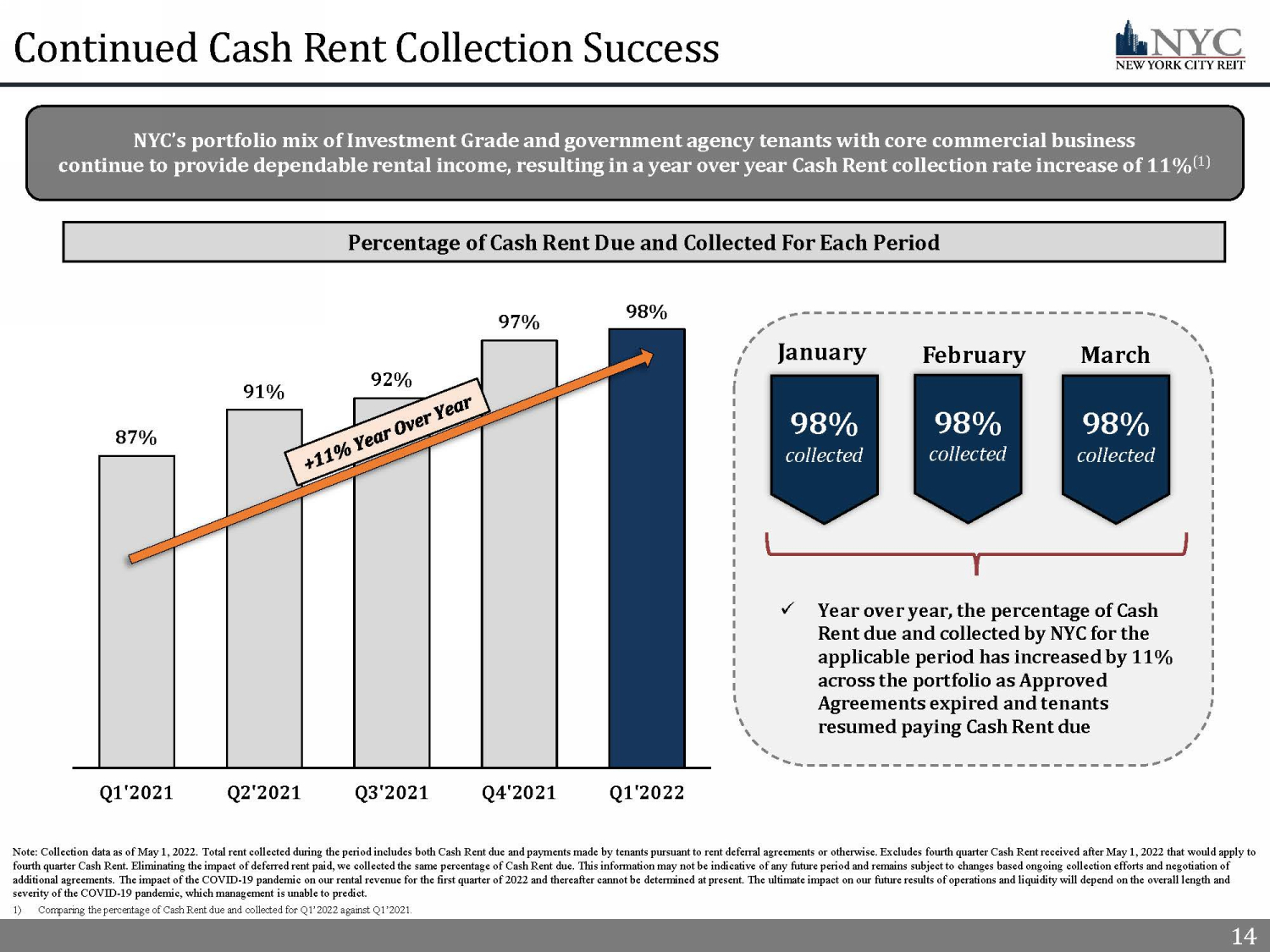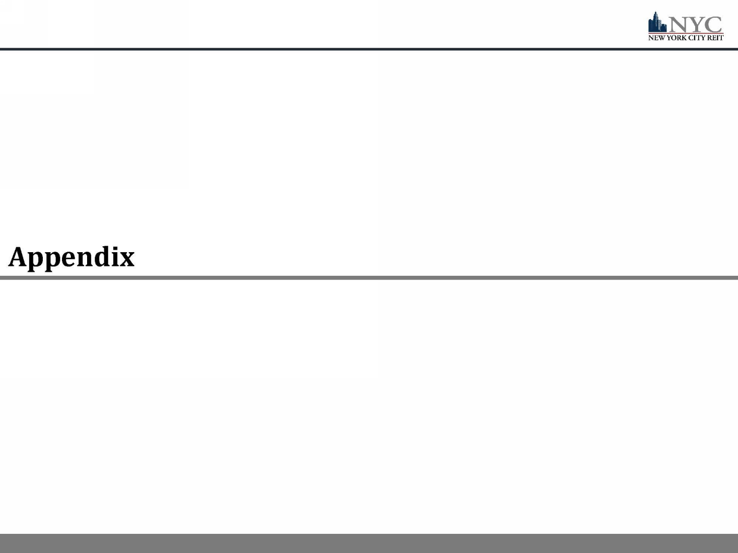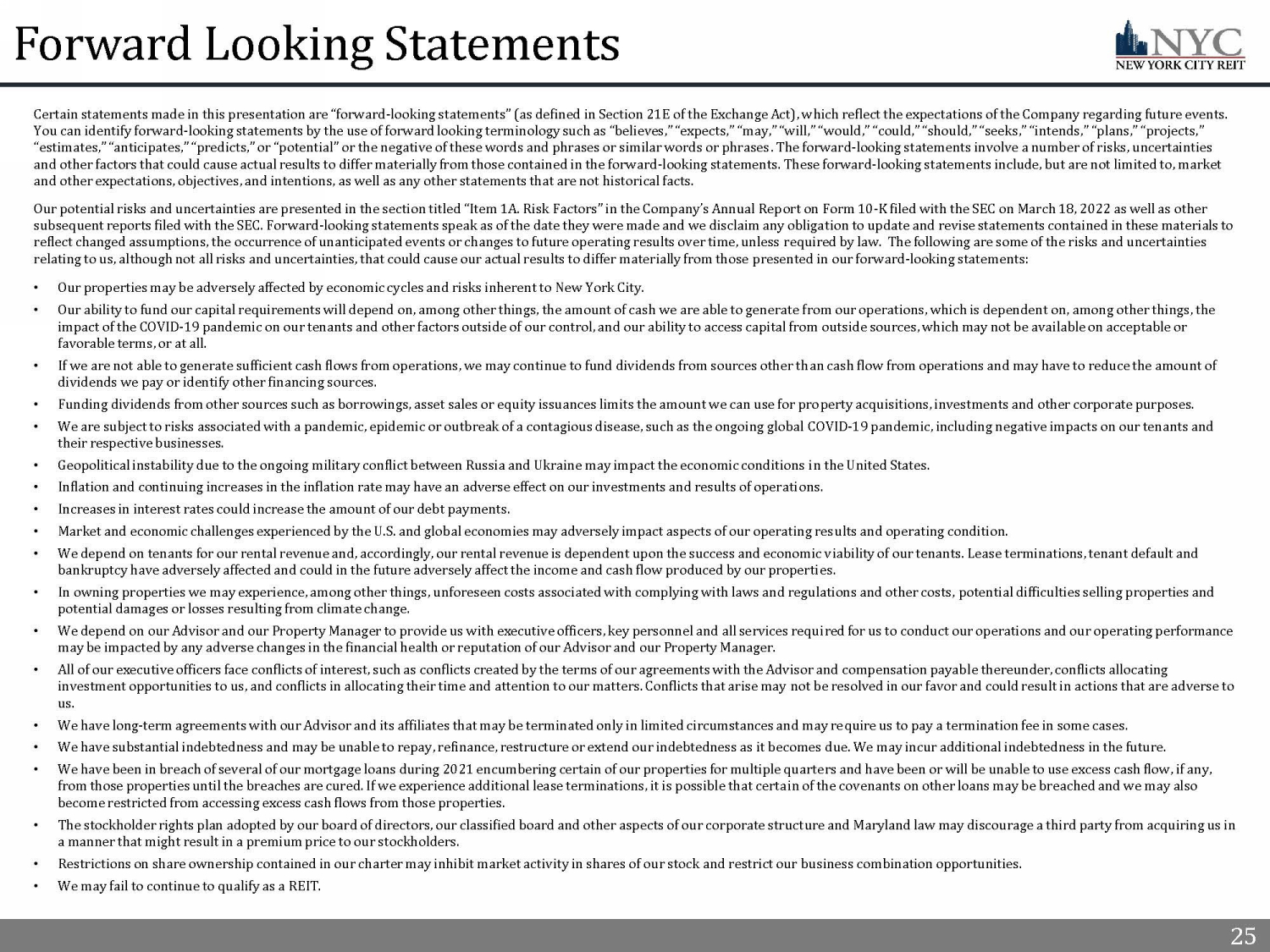 24 24 Important Additional Information and Where to Find It References in this presentation to the “Company,” “we,” “us” and “our” refer to New York City REIT, Inc. (“NYC”) and its cons oli dated subsidiaries. This presentation contains estimates and information concerning the Company’s industry and the Company’s peer companies that are based on industry publications, reports and peer company public filings. The Company has not independently verified the accuracy of the data co nta ined in these industry publications, reports and peer company public filings. These estimates and information involve a number of assumptions and li mit ations, and you are cautioned not to rely on or give undue weight to this information. The industry in which we operate is subject to a high deg ree of uncertainty and risk due to variety of factors, including those described in the “Risk Factors” and “Management's Discussion and Analysis of Financial Co ndi tion and Results of Operations” sections of the Company’s Annual Report on Form 10 - K filed with the SEC on March 18, 2022 and all other filings file d with the SEC after that date. These and other factors could cause results to differ materially from those expressed in these publications and reports . The majority of the concessions granted to our tenants as a result of the COVID - 19 pandemic are rent deferrals or temporary rent abatements with the original lease term unchanged and collection of deferred rent deemed probable. As a result of relief granted by the FASB and the SEC related to lease modification accounting, rental revenue used to calculate Net Income, NAREIT FFO, Core FFO, EBITDA, and Adjusted EBITDA has n ot been, and we do not expect it to be, significantly impacted by these types of deferrals. 24