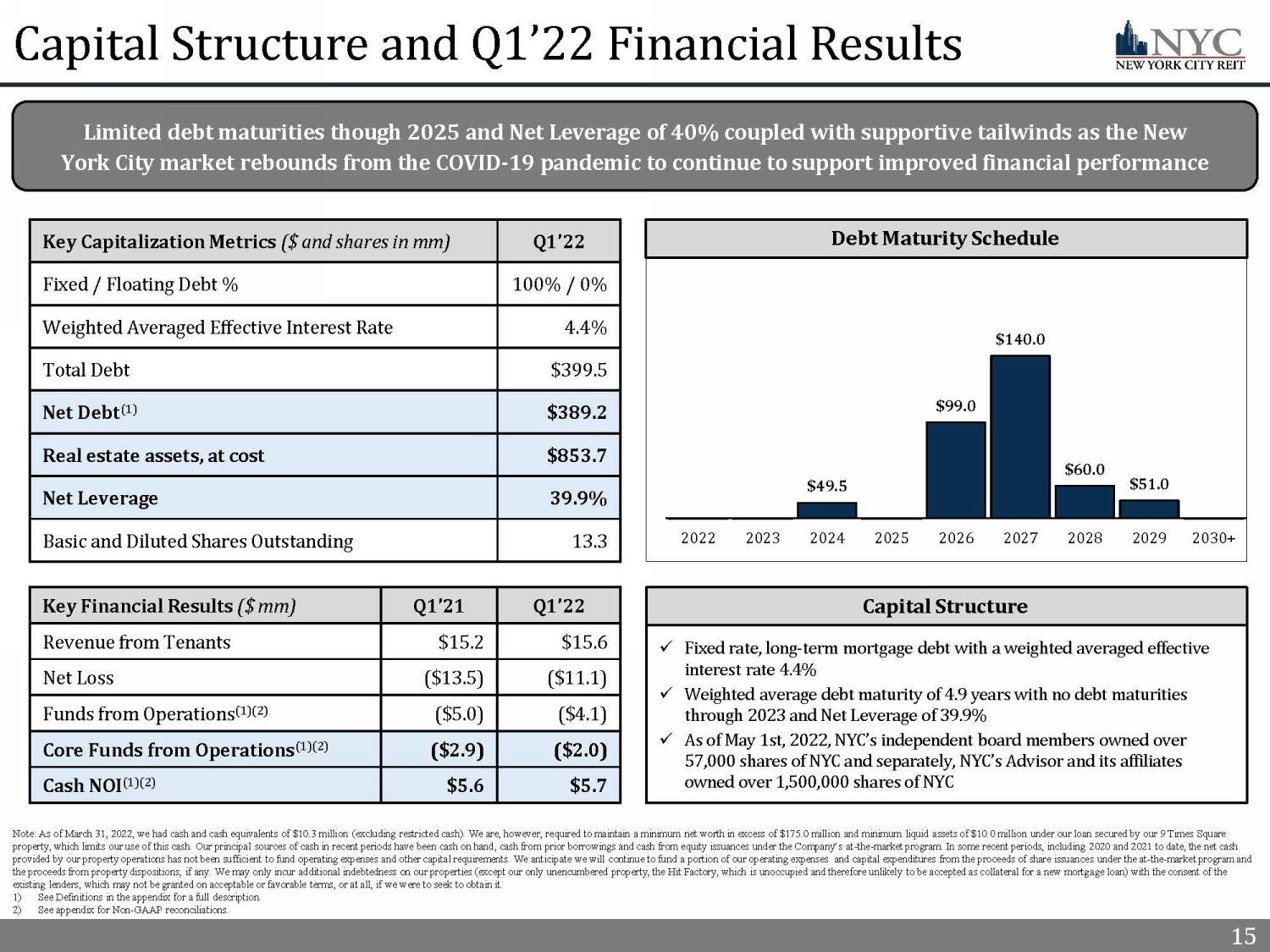15 15 Capital Structure and Q1’22 Financial Results Note: As of March 31, 2022, we had cash and cash equivalents of $10.3 million (excluding restricted cash). We are, however, r equ ired to maintain a minimum net worth in excess of $175.0 million and minimum liquid assets of $10.0 million under our loan se cur ed by our 9 Times Square property, which limits our use of this cash. Our principal sources of cash in recent periods have been cash on hand, cash fro m p rior borrowings and cash from equity issuances under the Company’s at - the - market program. In some recent periods, including 2020 and 2021 to date, the net cash provided by our property operations has not been sufficient to fund operating expenses and other capital requirements. We ant ici pate we will continue to fund a portion of our operating expenses and capital expenditures from the proceeds of share issuan ces under the at - the - market program and the proceeds from property dispositions, if any. We may only incur additional indebtedness on our properties (except our only un encumbered property, the Hit Factory, which is unoccupied and therefore unlikely to be accepted as collateral for a new mortg age loan) with the consent of the existing lenders, which may not be granted on acceptable or favorable terms, or at all, if we were to seek to obtain it. 1) See Definitions in the appendix for a full description. 2) See appendix for Non - GAAP reconciliations. Limited debt maturities though 2025 and Net Leverage of 40% coupled with supportive tailwinds as the New York City market rebounds from the COVID - 19 pandemic to continue to support improved financial performance Key Capitalization Metrics ($ and shares in mm) Q1’22 Fixed / Floating Debt % 100% / 0% Weighted Averaged Effective Interest Rate 4.4% Total Debt $399.5 Net Debt (1) $389.2 Real estate assets, at cost $853.7 Net Leverage 39.9% Basic and Diluted Shares Outstanding 13.3 Debt Maturity Schedule $49.5 $99.0 $140.0 $60.0 $51.0 $40.0 $60.0 $80.0 $100.0 $120.0 $140.0 $160.0 $180.0 2022 2023 2024 2025 2026 2027 2028 2029 2030+ Key Financial Results ($ mm) Q1’21 Q1’22 Revenue from Tenants $15.2 $15.6 Net Loss ($13.5) ($11.1) Funds from Operations (1)(2) ($5.0) ($4.1) Core Funds from Operations (1)(2) ($2.9) ($2.0) Cash NOI (1)(2) $5.6 $5.7 Capital Structure x Fixed rate, long - term mortgage debt with a weighted averaged effective interest rate 4.4% x Weighted average debt maturity of 4.9 years with no debt maturities through 2023 and Net Leverage of 39.9% x As of May 1st, 2022, NYC’s independent board members owned over 57,000 shares of NYC and separately, NYC’s Advisor and its affiliates owned over 1,500,000 shares of NYC