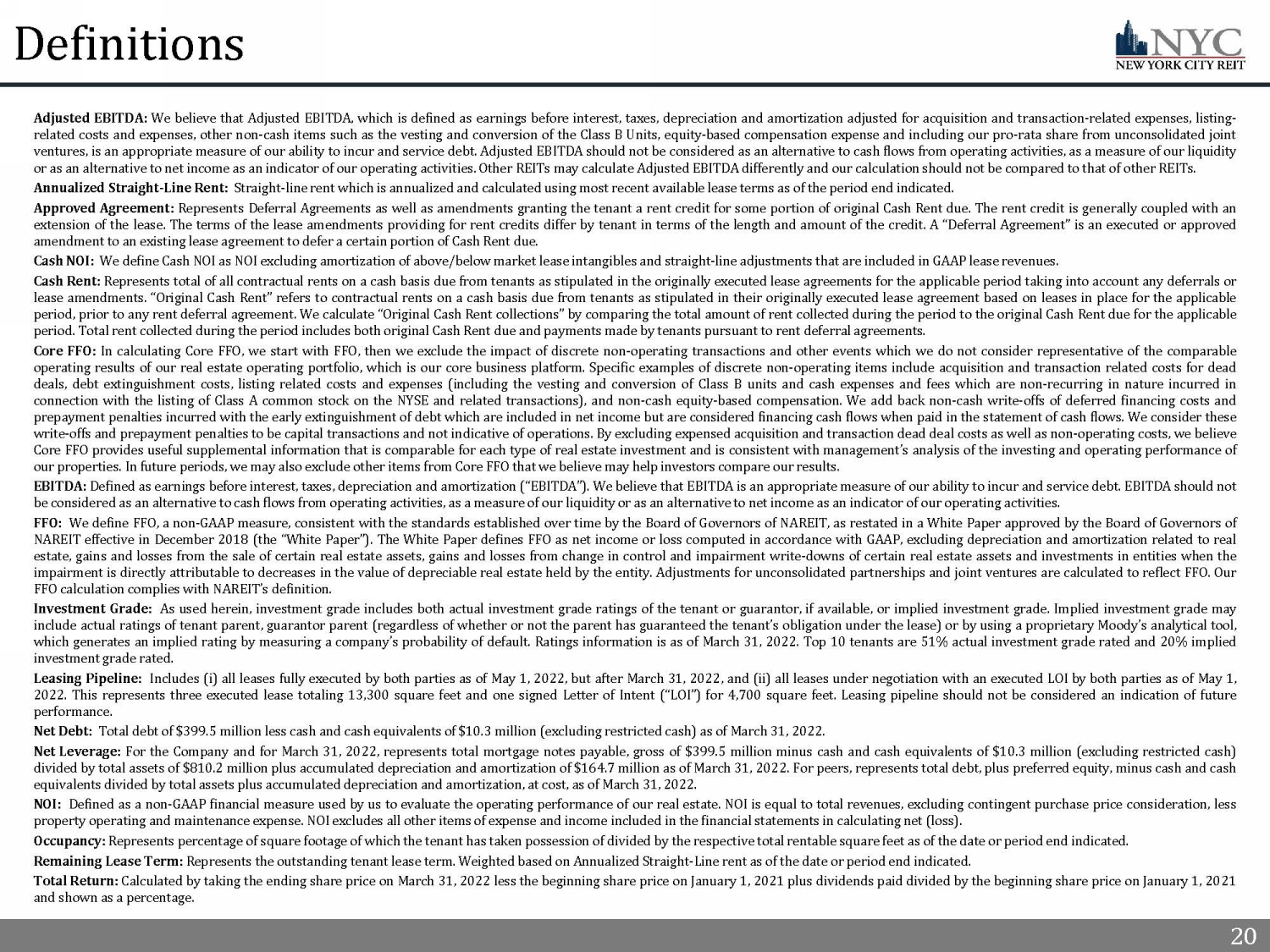 20 20 Definitions Adjusted EBITDA : We believe that Adjusted EBITDA, which is defined as earnings before interest, taxes, depreciation and amortization adjusted for acquisition and transaction - related expenses, listing - related costs and expenses, other non - cash items such as the vesting and conversion of the Class B Units, equity - based compensation expense and including our pro - rata share from unconsolidated joint ventures, is an appropriate measure of our ability to incur and service debt . Adjusted EBITDA should not be considered as an alternative to cash flows from operating activities, as a measure of our liquidity or as an alternative to net income as an indicator of our operating activities . Other REITs may calculate Adjusted EBITDA differently and our calculation should not be compared to that of other REITs . Annualized Straight - Line Rent : Straight - line rent which is annualized and calculated using most recent available lease terms as of the period end indicated . Approved Agreement : Represents Deferral Agreements as well as amendments granting the tenant a rent credit for some portion of original Cash Rent due . The rent credit is generally coupled with an extension of the lease . The terms of the lease amendments providing for rent credits differ by tenant in terms of the length and amount of the credit . A “Deferral Agreement” is an executed or approved amendment to an existing lease agreement to defer a certain portion of Cash Rent due . Cash NOI : We define Cash NOI as NOI excluding amortization of above/below market lease intangibles and straight - line adjustments that are included in GAAP lease revenues . Cash Rent : Represents total of all contractual rents on a cash basis due from tenants as stipulated in the originally executed lease agreements for the applicable period taking into account any deferrals or lease amendments . “Original Cash Rent” refers to contractual rents on a cash basis due from tenants as stipulated in their originally executed lease agreement based on leases in place for the applicable period, prior to any rent deferral agreement . We calculate “Original Cash Rent collections” by comparing the total amount of rent collected during the period to the original Cash Rent due for the applicable period . Total rent collected during the period includes both original Cash Rent due and payments made by tenants pursuant to rent deferral agreements . Core FFO : In calculating Core FFO, we start with FFO, then we exclude the impact of discrete non - operating transactions and other events which we do not consider representative of the comparable operating results of our real estate operating portfolio, which is our core business platform . Specific examples of discrete non - operating items include acquisition and transaction related costs for dead deals, debt extinguishment costs, listing related costs and expenses (including the vesting and conversion of Class B units and cash expenses and fees which are non - recurring in nature incurred in connection with the listing of Class A common stock on the NYSE and related transactions), and non - cash equity - based compensation . We add back non - cash write - offs of deferred financing costs and prepayment penalties incurred with the early extinguishment of debt which are included in net income but are considered financing cash flows when paid in the statement of cash flows . We consider these write - offs and prepayment penalties to be capital transactions and not indicative of operations . By excluding expensed acquisition and transaction dead deal costs as well as non - operating costs, we believe Core FFO provides useful supplemental information that is comparable for each type of real estate investment and is consistent with management’s analysis of the investing and operating performance of our properties . In future periods, we may also exclude other items from Core FFO that we believe may help investors compare our results . EBITDA : Defined as earnings before interest, taxes, depreciation and amortization (“EBITDA”) . We believe that EBITDA is an appropriate measure of our ability to incur and service debt . EBITDA should not be considered as an alternative to cash flows from operating activities, as a measure of our liquidity or as an alternative to net income as an indicator of our operating activities . FFO : We define FFO, a non - GAAP measure, consistent with the standards established over time by the Board of Governors of NAREIT, as restated in a White Paper approved by the Board of Governors of NAREIT effective in December 2018 (the “White Paper”) . The White Paper defines FFO as net income or loss computed in accordance with GAAP, excluding depreciation and amortization related to real estate, gains and losses from the sale of certain real estate assets, gains and losses from change in control and impairment write - downs of certain real estate assets and investments in entities when the impairment is directly attributable to decreases in the value of depreciable real estate held by the entity . Adjustments for unconsolidated partnerships and joint ventures are calculated to reflect FFO . Our FFO calculation complies with NAREIT’s definition . Investment Grade : As used herein, investment grade includes both actual investment grade ratings of the tenant or guarantor, if available, or implied investment grade . Implied investment grade may include actual ratings of tenant parent, guarantor parent (regardless of whether or not the parent has guaranteed the tenant’s obligation under the lease) or by using a proprietary Moody’s analytical tool, which generates an implied rating by measuring a company’s probability of default . Ratings information is as of March 31 , 2022 . Top 10 tenants are 51 % actual investment grade rated and 20 % implied investment grade rated . Leasing Pipeline : Includes ( i ) all leases fully executed by both parties as of May 1