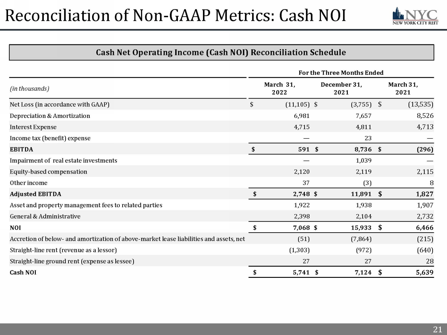 21 21 Reconciliation of Non - GAAP Metrics: Cash NOI For the Three Months Ended (in thousands) March 31, 2022 December 31, 2021 March 31, 2021 Net Loss (in accordance with GAAP) $ (11,105) $ (3,755) $ (13,535) Depreciation & Amortization 6,981 7,657 8,526 Interest Expense 4,715 4,811 4,713 Income tax (benefit) expense — 23 — EBITDA $ 591 $ 8,736 $ (296) Impairment of real estate investments — 1,039 — Equity - based compensation 2,120 2,119 2,115 Other income 37 (3) 8 Adjusted EBITDA $ 2,748 $ 11,891 $ 1,827 Asset and property management fees to related parties 1,922 1,938 1,907 General & Administrative 2,398 2,104 2,732 NOI $ 7,068 $ 15,933 $ 6,466 Accretion of below - and amortization of above - market lease liabilities and assets, net (51) (7,864) (215) Straight - line rent (revenue as a lessor) (1,303) (972) (640) Straight - line ground rent (expense as lessee) 27 27 28 Cash NOI $ 5,741 $ 7,124 $ 5,639 Cash Net Operating Income (Cash NOI) Reconciliation Schedule